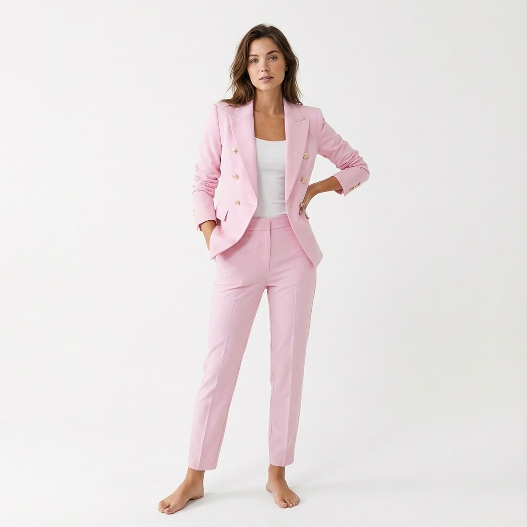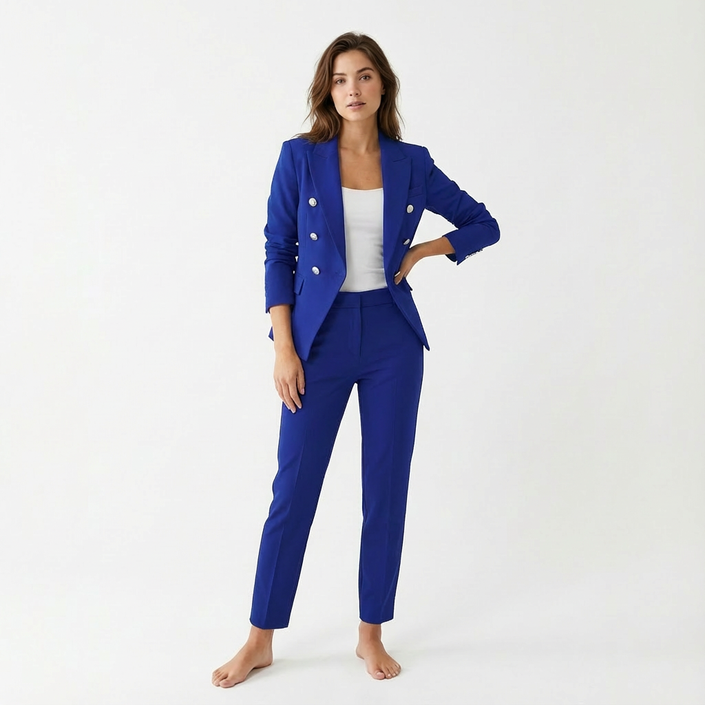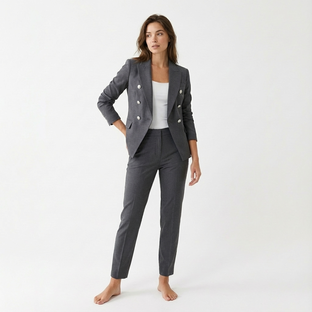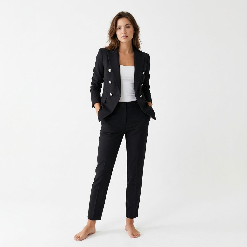 A tailored double-breasted blazer and trousers set with metallic buttons. Structured suiting and straight legs create a polished silhouette from desk to dinner.