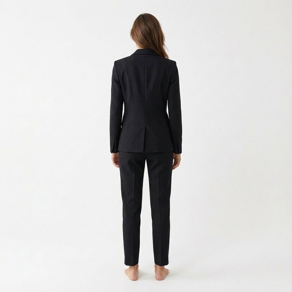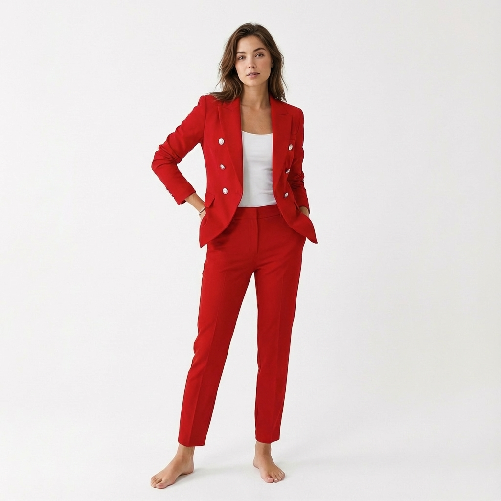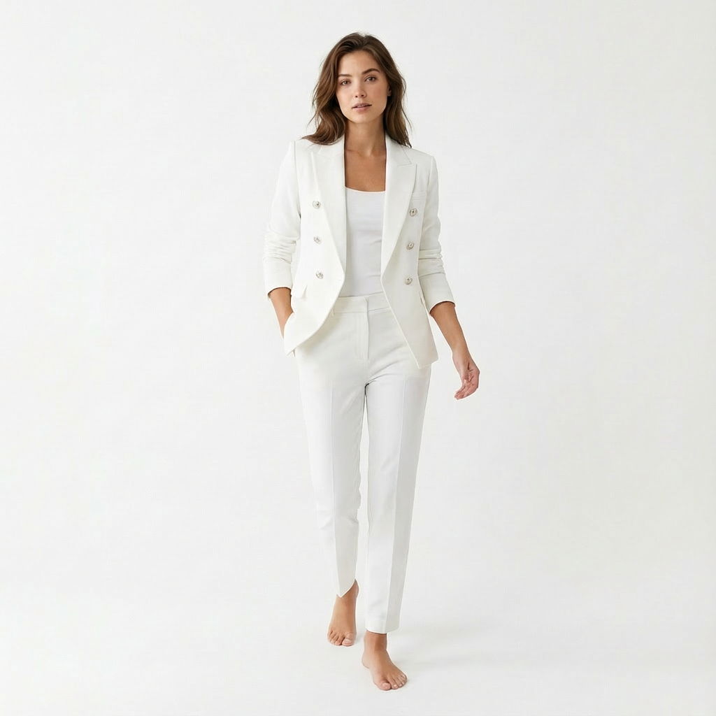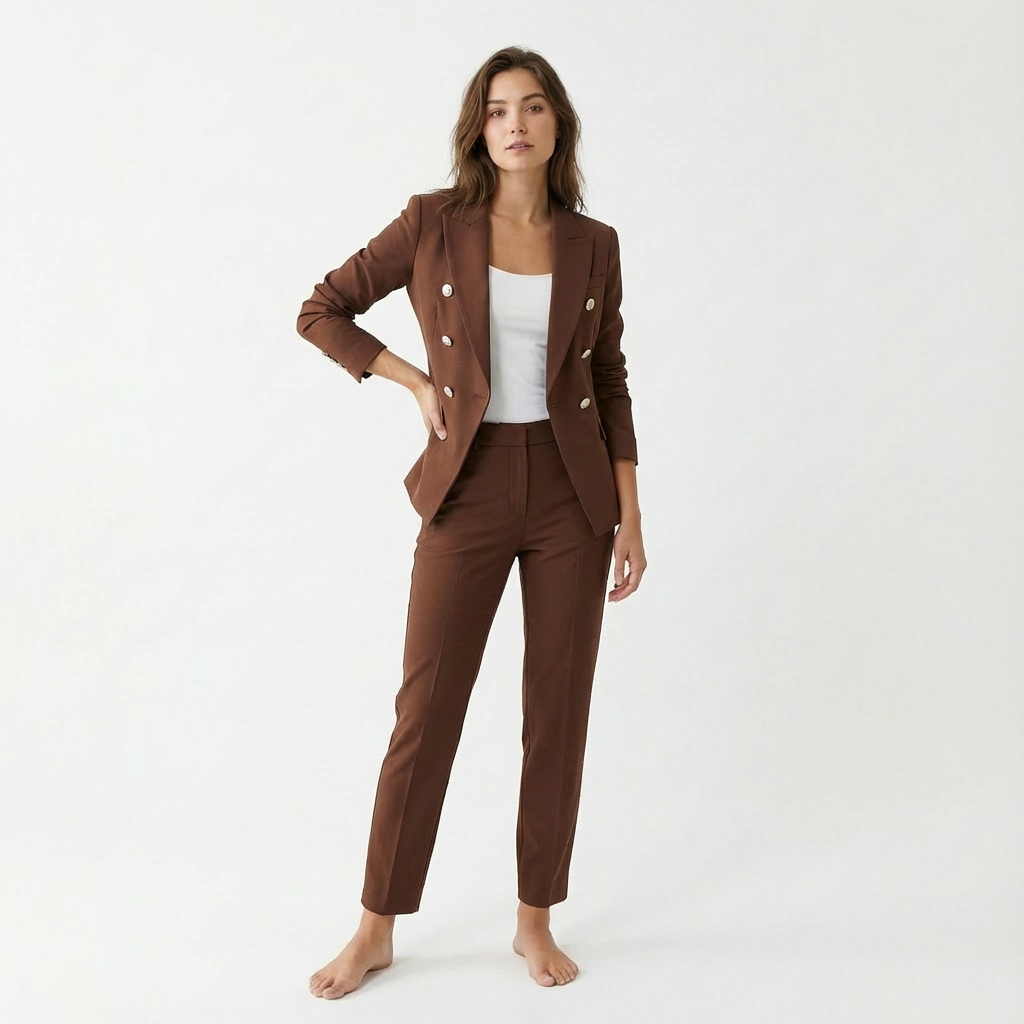 A tailored double-breasted blazer and trousers set with metallic buttons. Structured suiting and straight legs create a polished silhouette from desk to dinner.