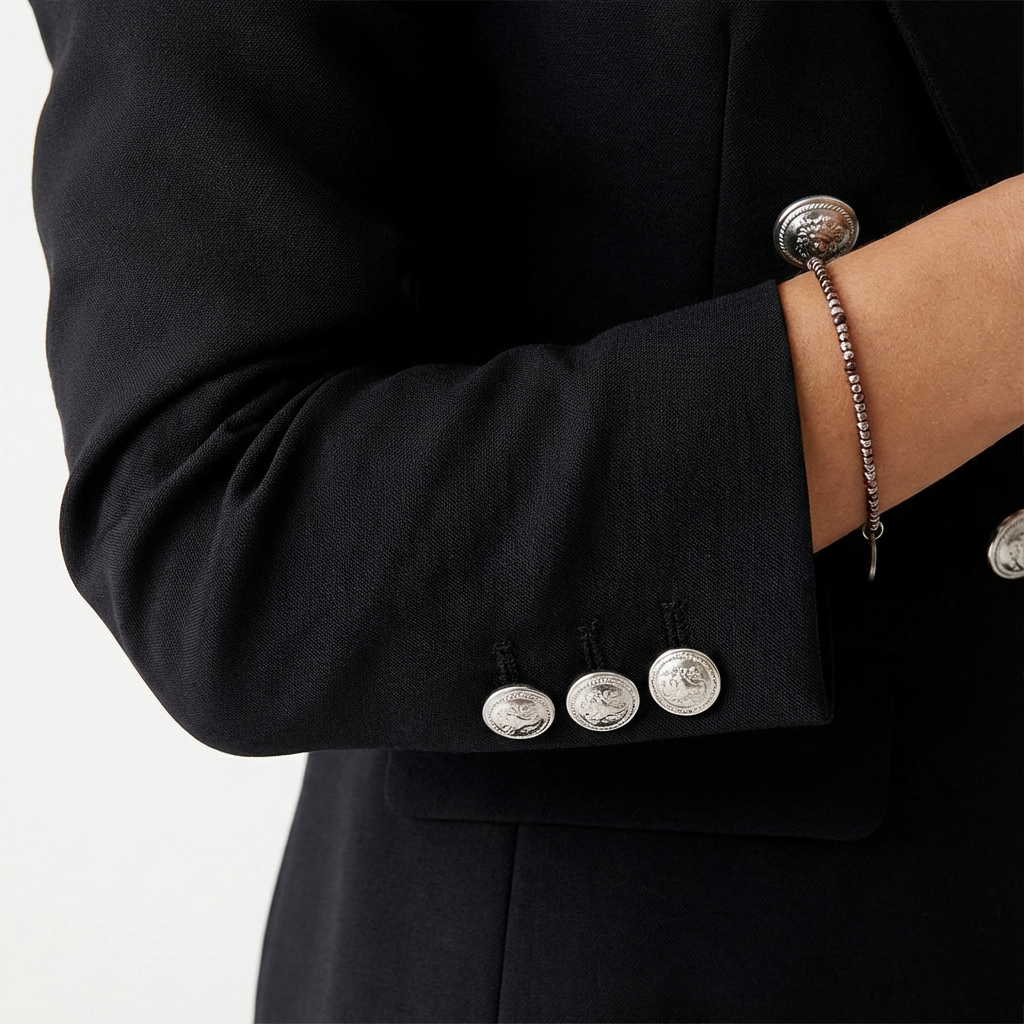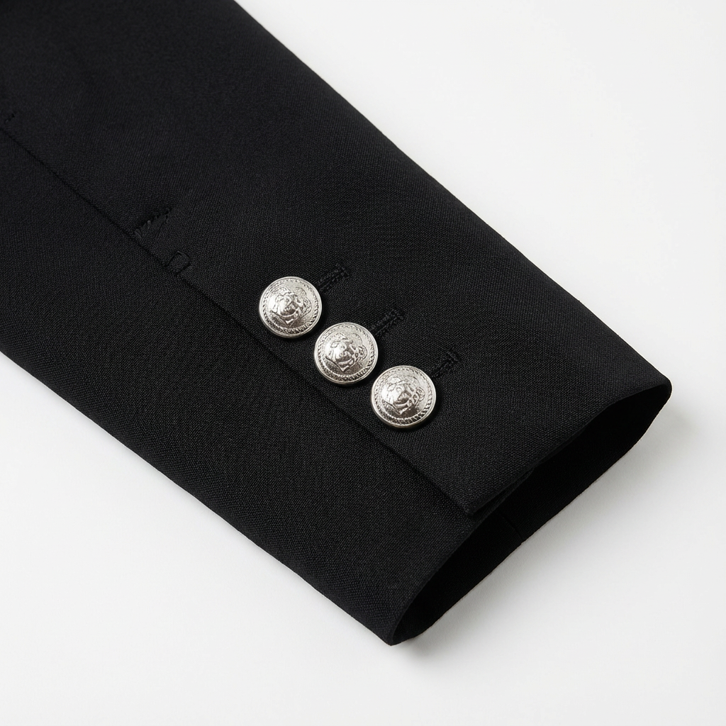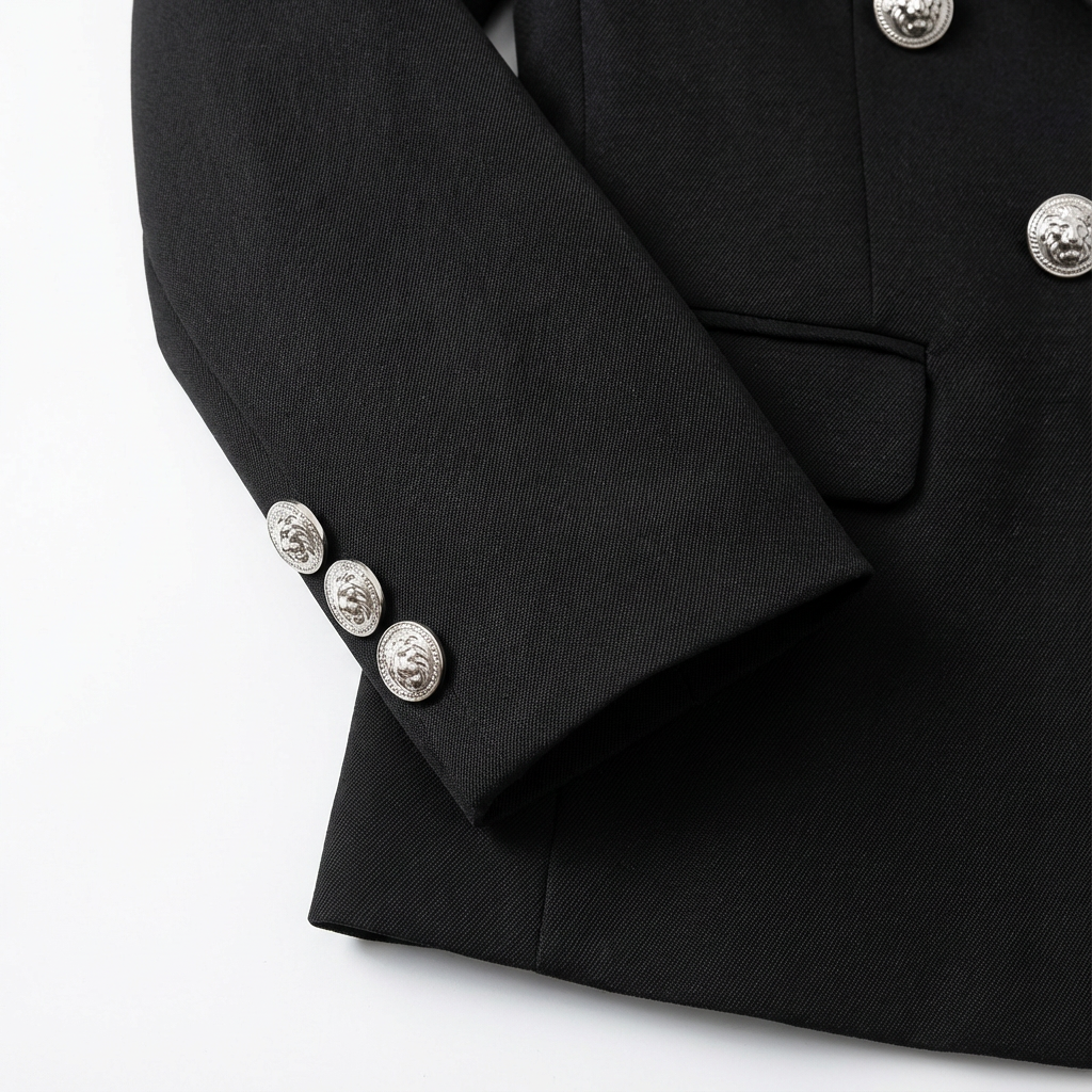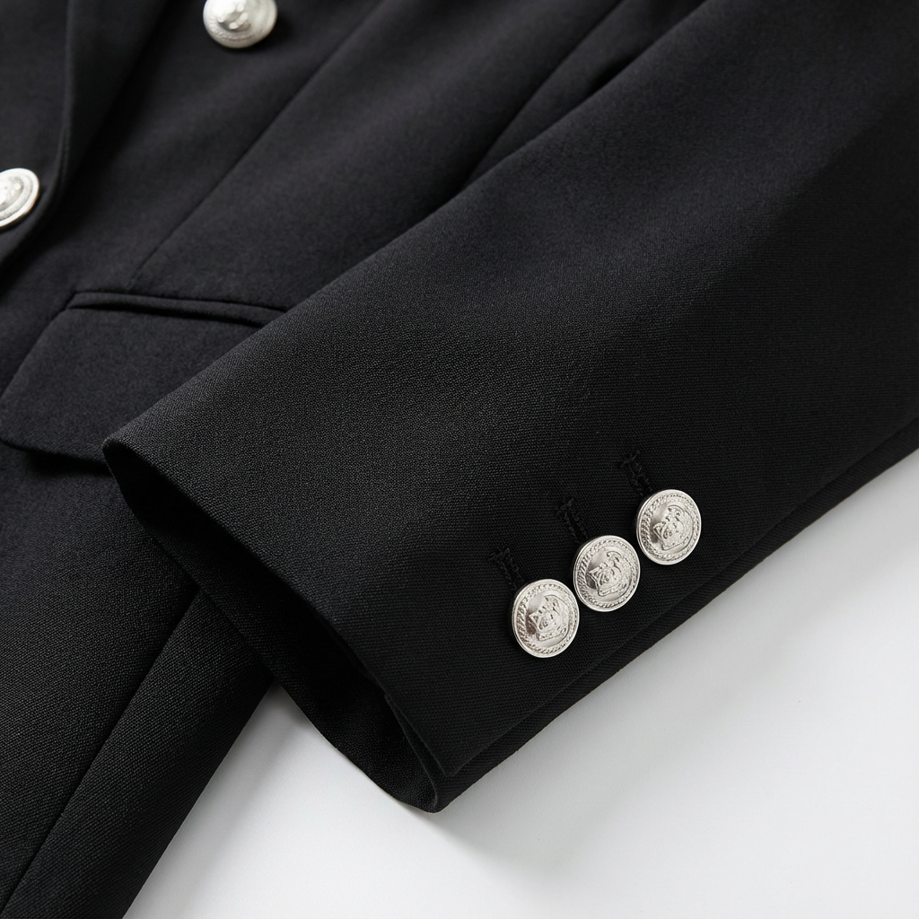 A tailored double-breasted blazer and trousers set with metallic buttons. Structured suiting and straight legs create a polished silhouette from desk to dinner.
