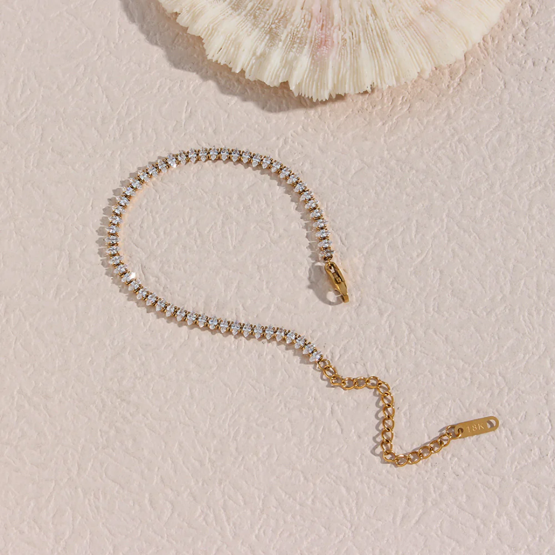 Meet the Women’s Simulated Diamond Tennis Bracelet, a classic tennis bracelet set with AAAAA diamond simulants in round or oval cuts and finished in radiant 18k gold. Waterproof and hypoallergenic, its adjustable fit offers timeless sparkle and everyday ease—perfect for gifting, layering, and polished wear.