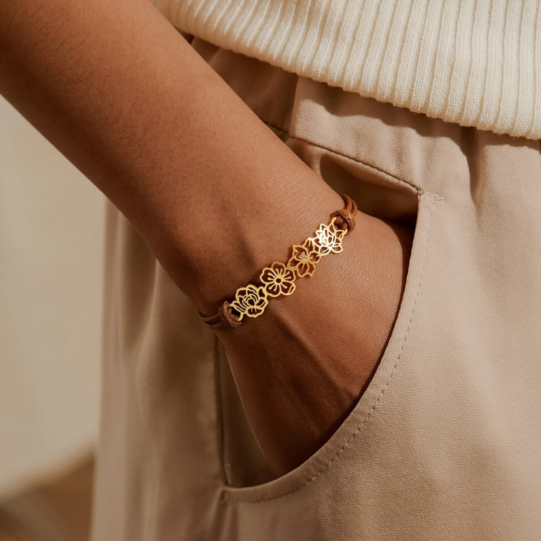 Add your family’s birth flowers to the bracelet. It’s a timeless keepsake of love, connection and cherished memories. The bracelet is adjustable between 16 cm and 25 cm. The bracelet is made from high-quality waxed cord. The birth flower charms are S925 sterling silver, available 18-carat gold-plated (gold), 18-carat rose-gold-plated (rose gold) or in a high-polish silver finish.