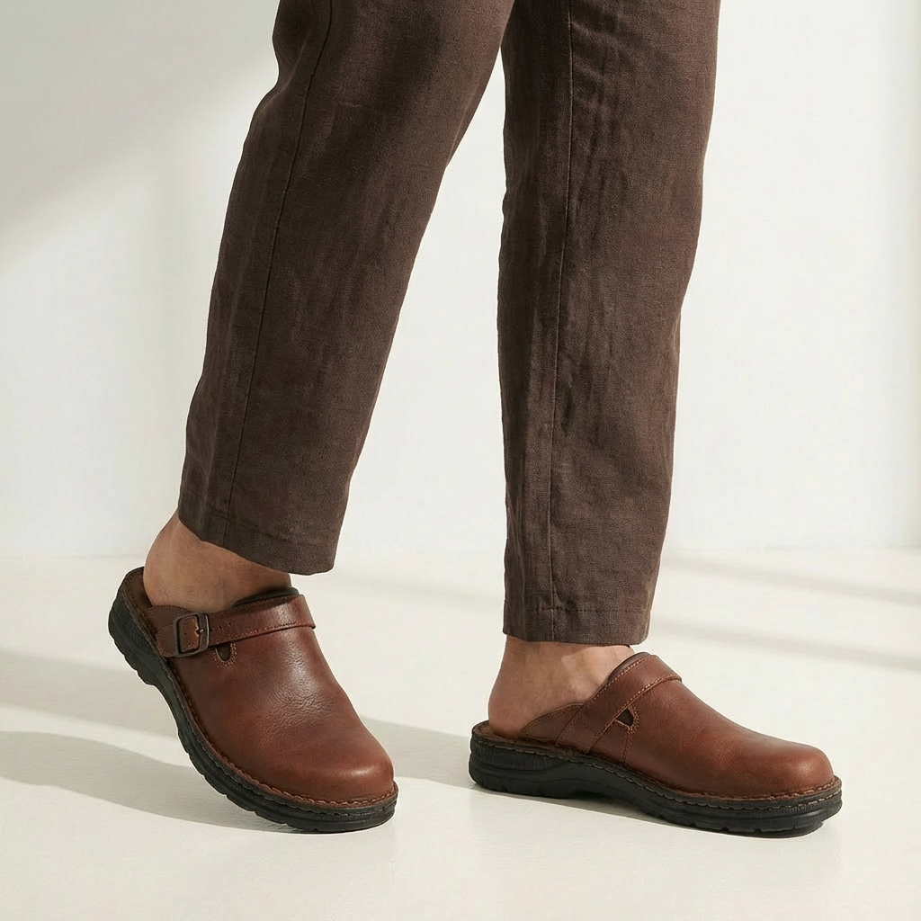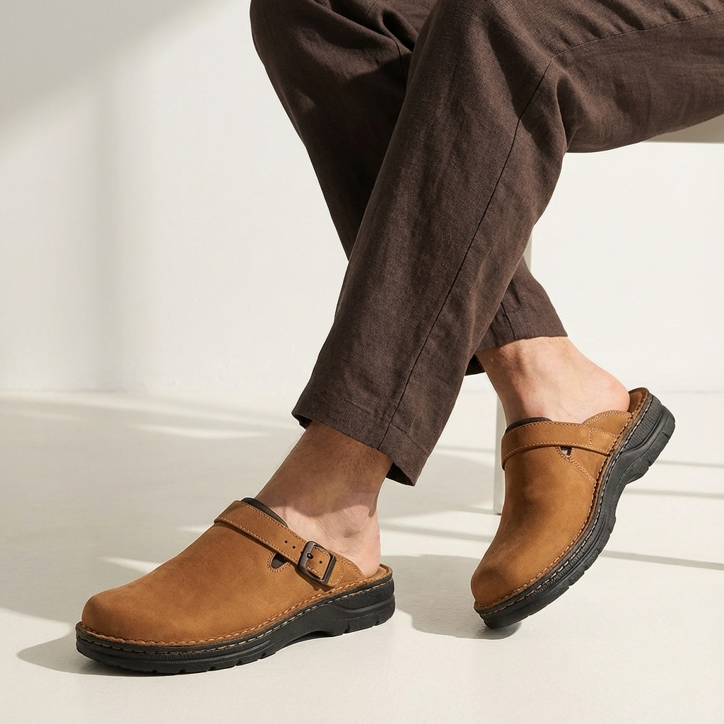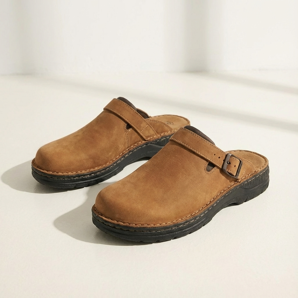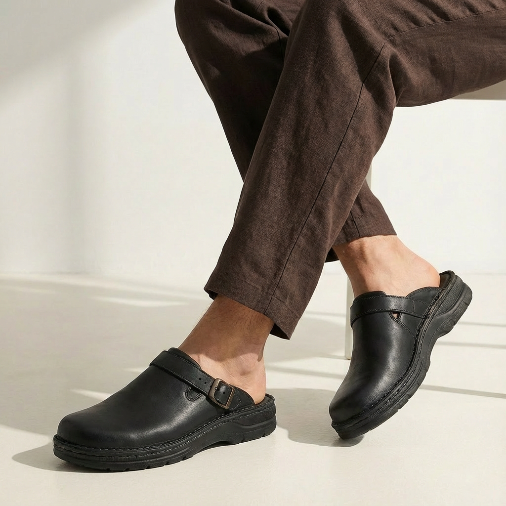 Men’s leather slippers with an ergonomic design. An adjustable strap and slip-on shape make them simple to wear at home.