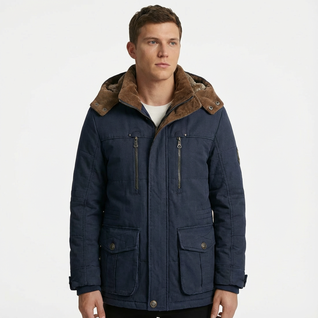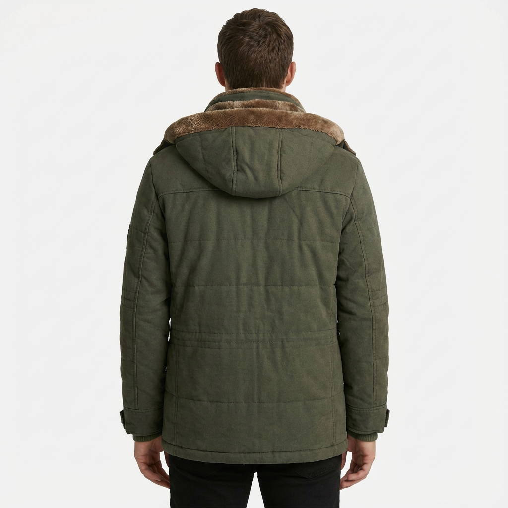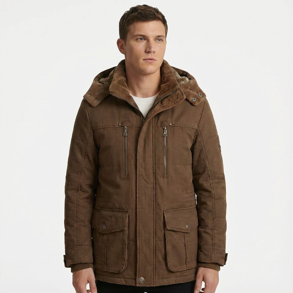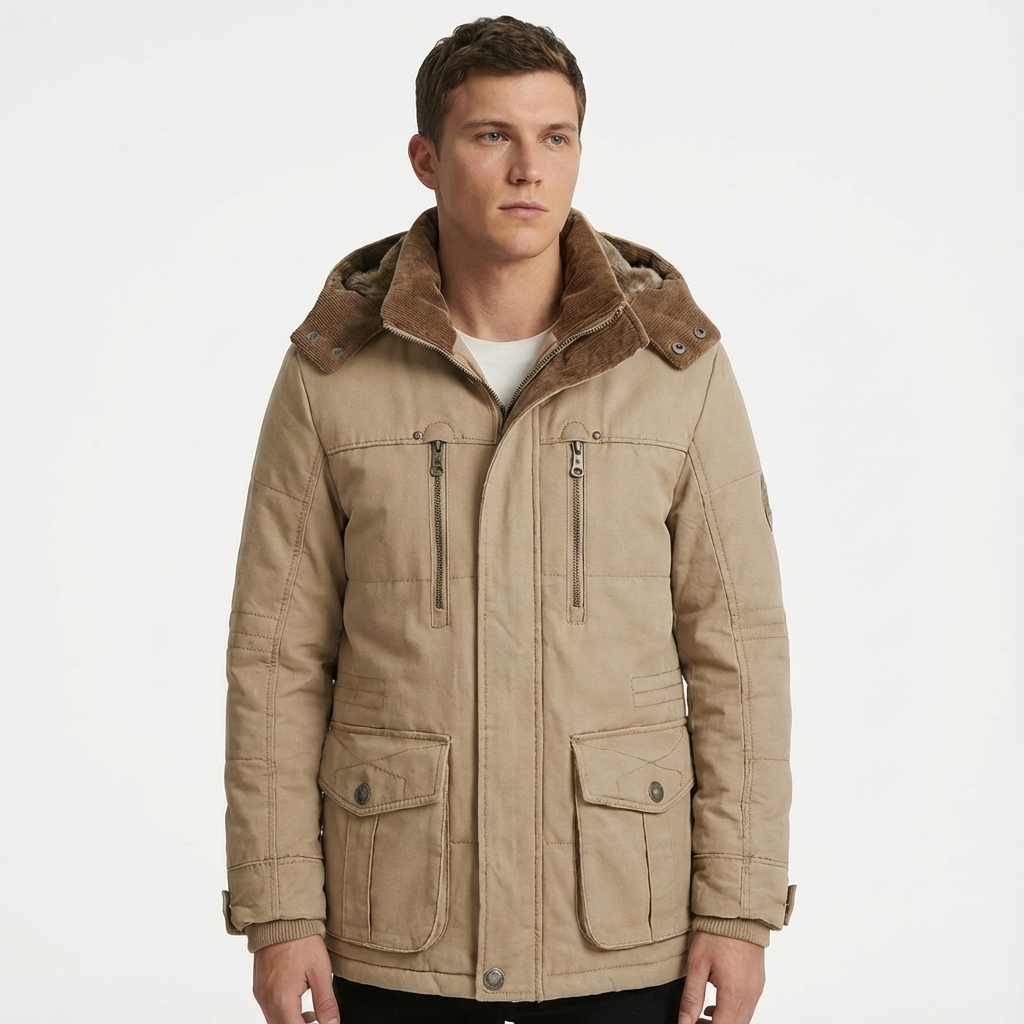A hooded down jacket with a sleek poly-blend shell. Waterproof and windproof protection and side pockets bring warm, practical ease for winter.