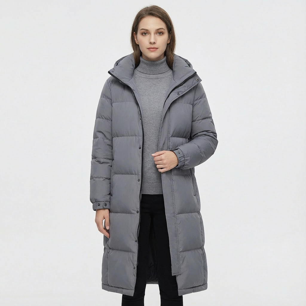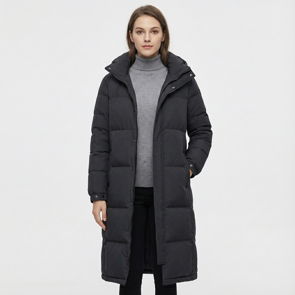 A long hooded quilted winter coat designed for warm, practical layering. The streamlined silhouette offers extra coverage while staying easy to wear day to day.