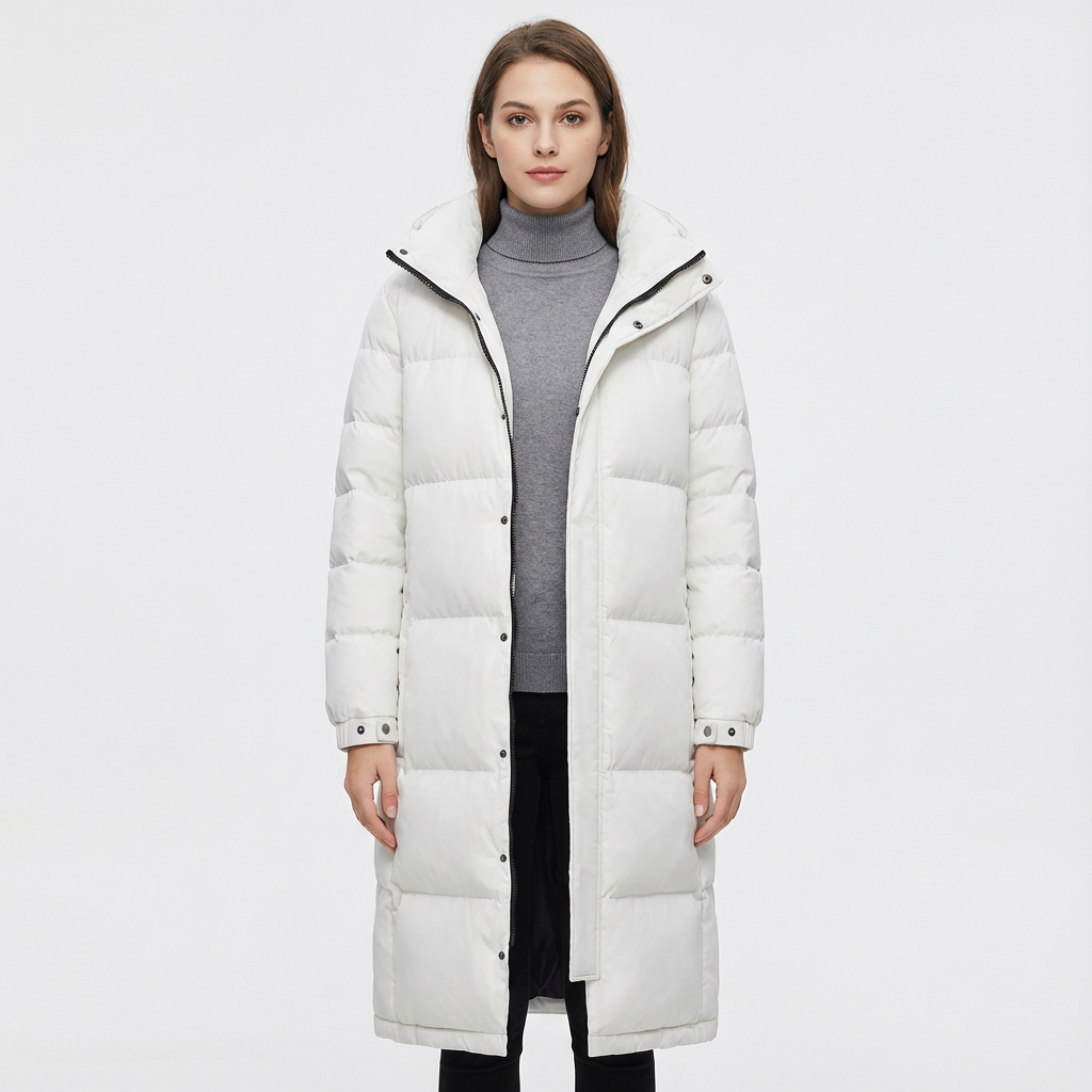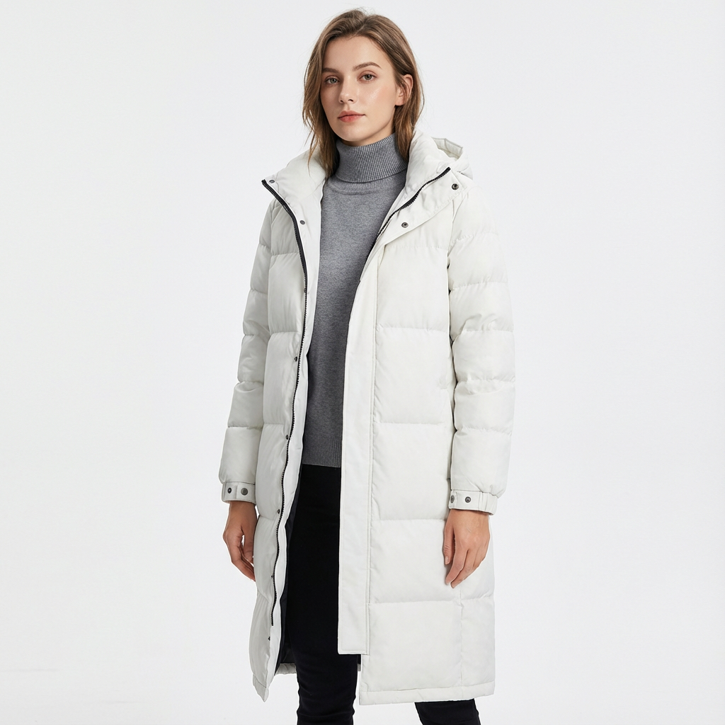 Design: Long quilted silhouette; attached hood; winter-ready padded look; clean, versatile finish.