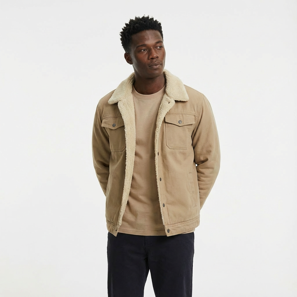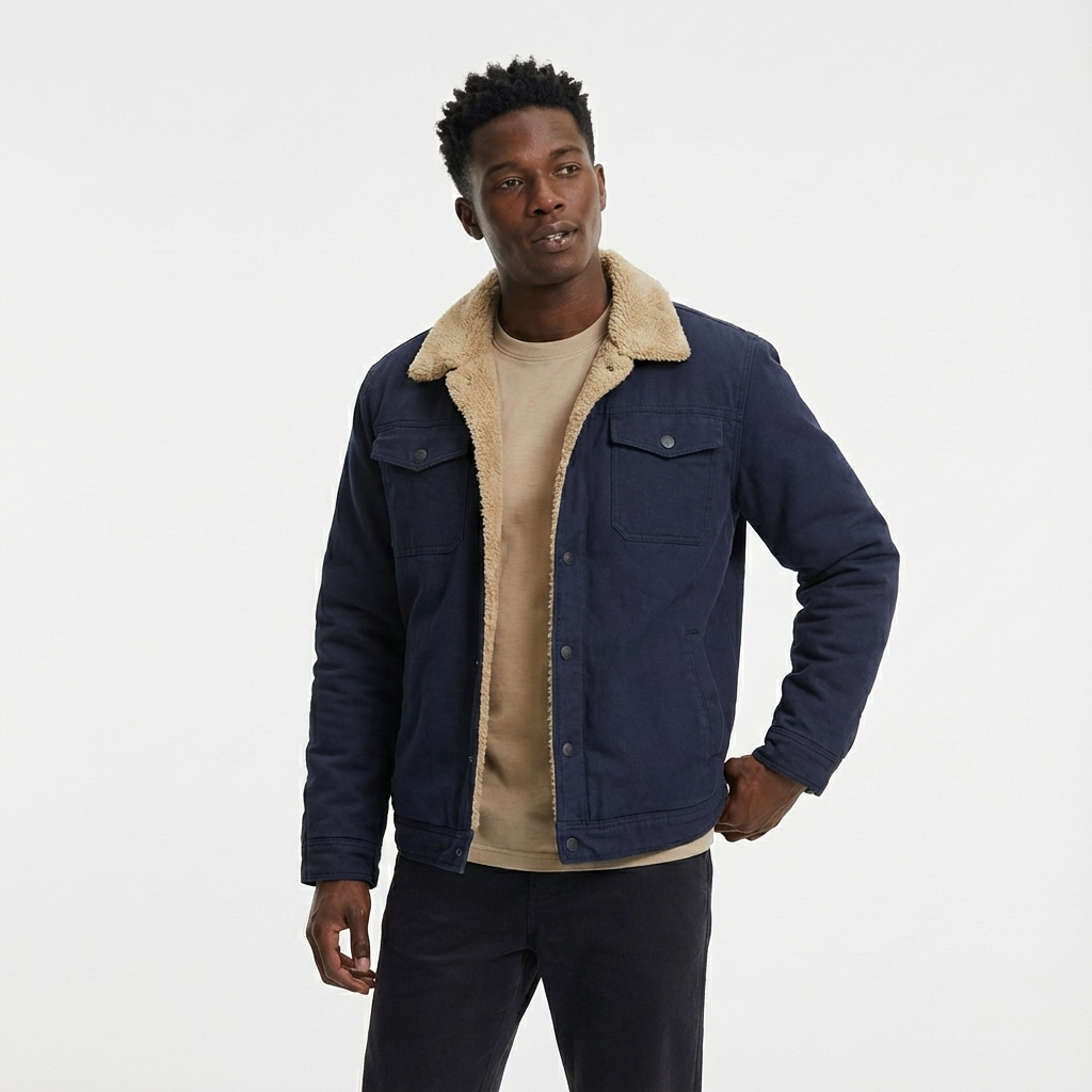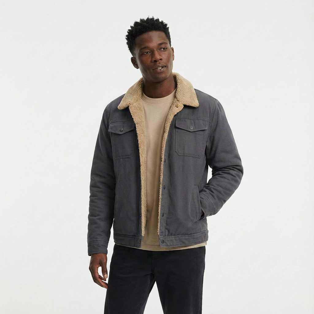 A sherpa-lined winter jacket with a contrast collar and front pockets. The soft fleece interior and sturdy woven shell deliver warm, everyday comfort.