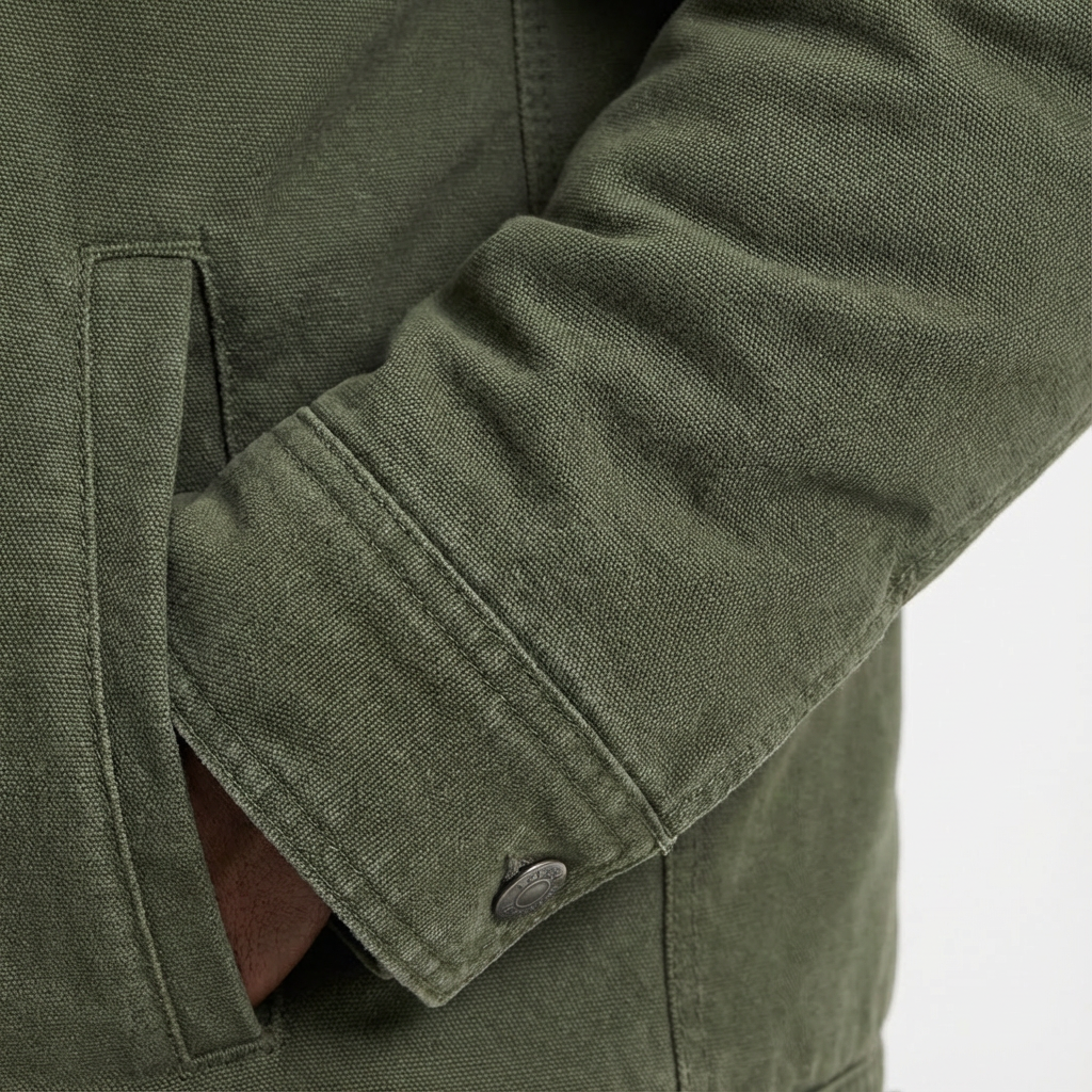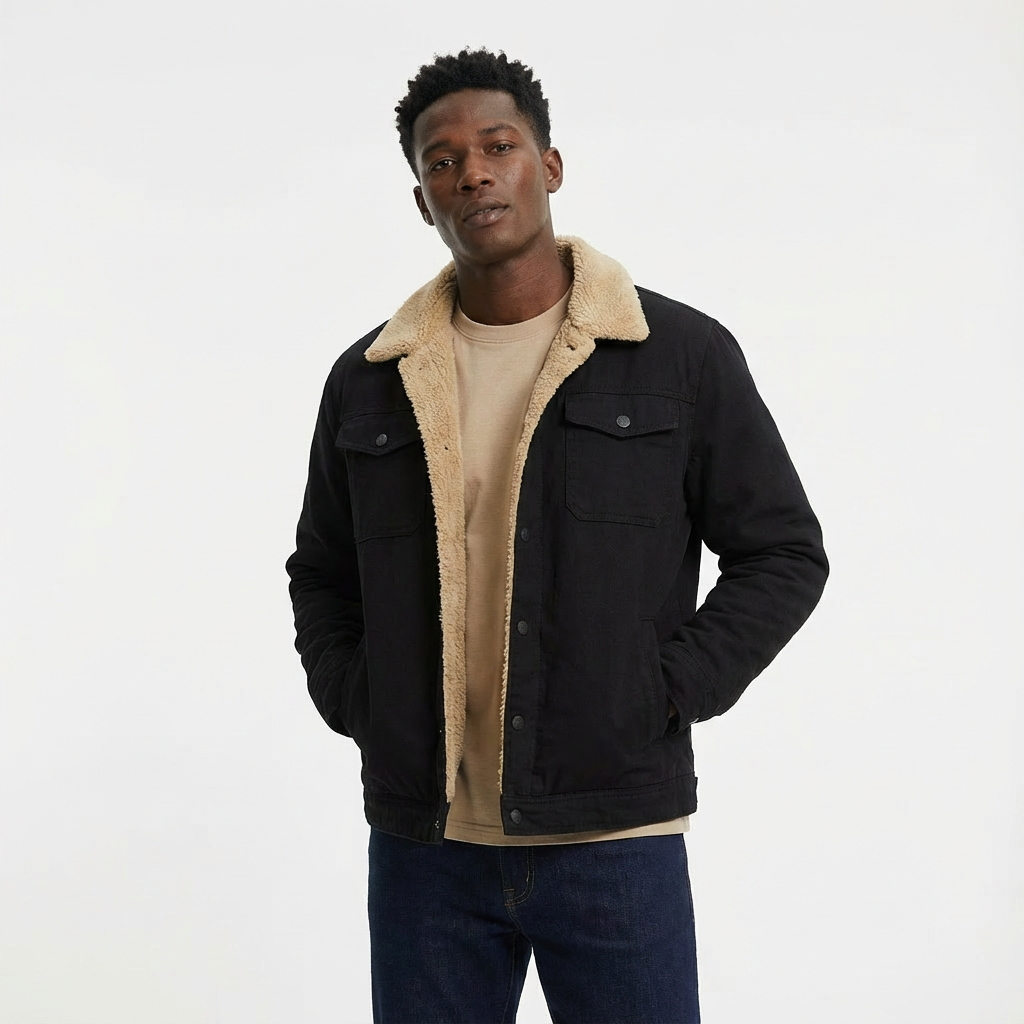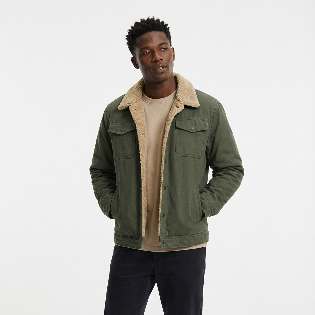 A sherpa-lined winter jacket with a contrast collar and front pockets. The soft fleece interior and sturdy woven shell deliver warm, everyday comfort.