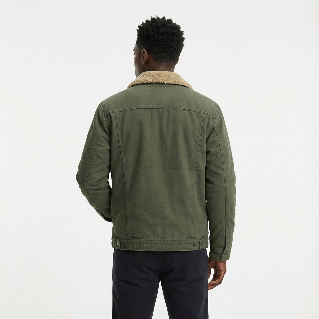 Design: Trucker-inspired silhouette; contrast sherpa collar; snap-button front; chest flap pockets; side hand pockets; fully lined.