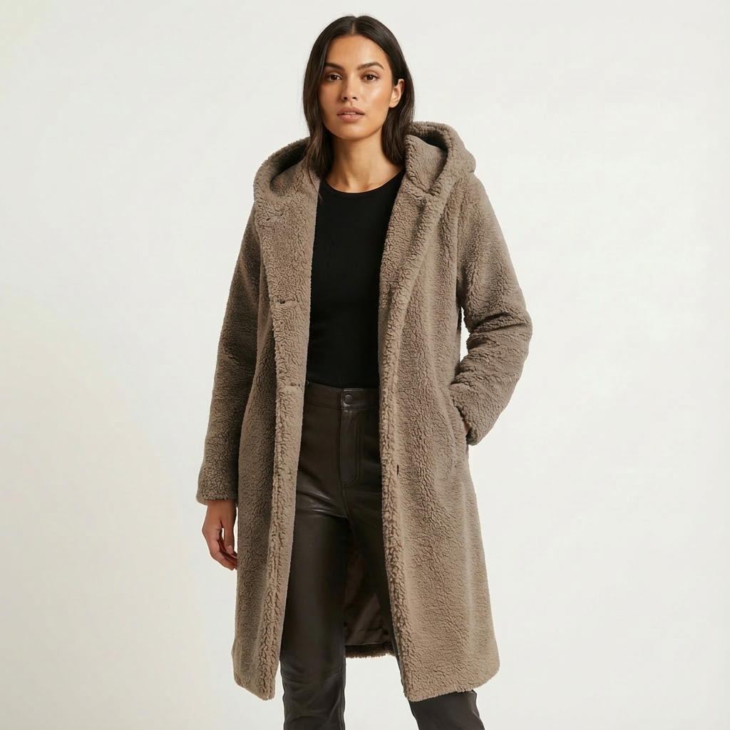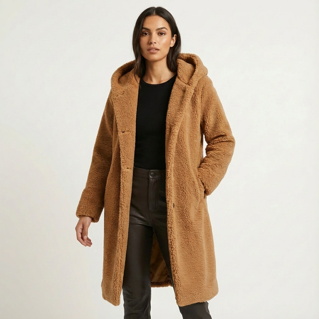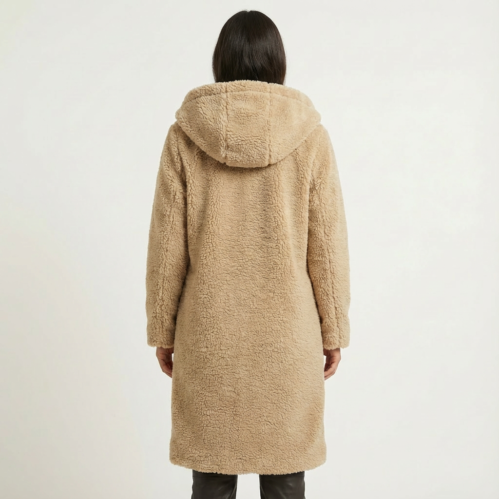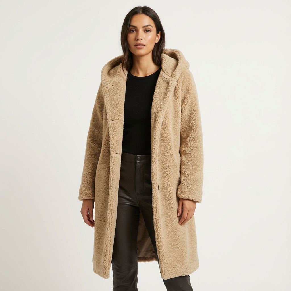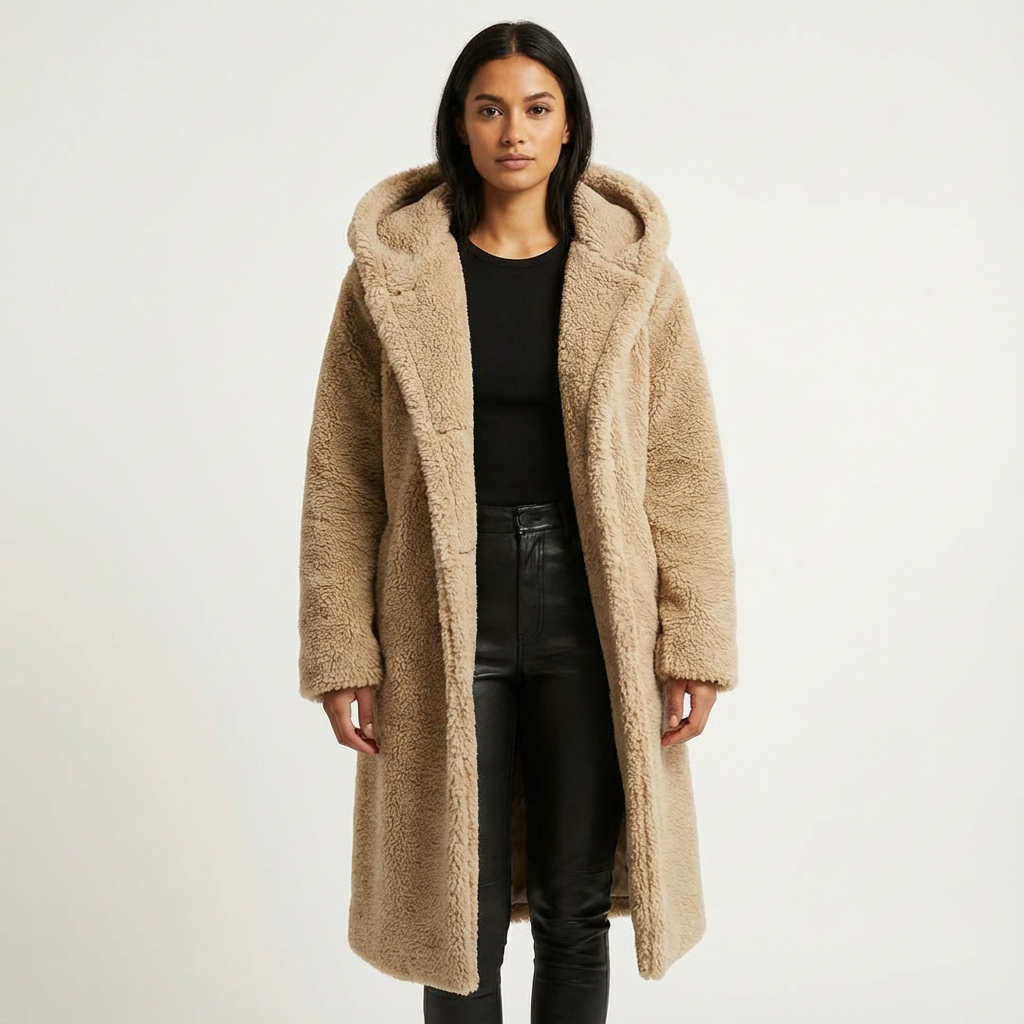 A faux-fur hooded winter coat with a longline silhouette. Plush texture and an oversized hood deliver warm coverage for cold days.