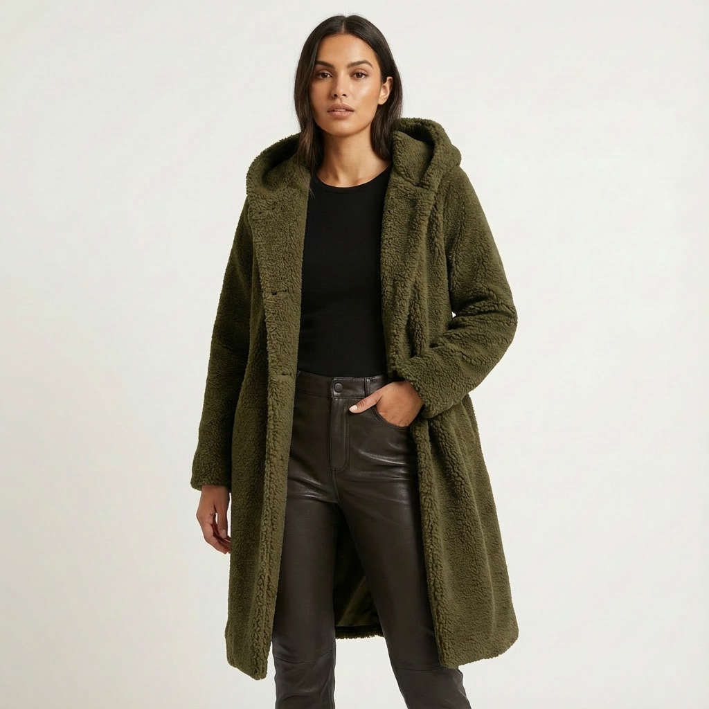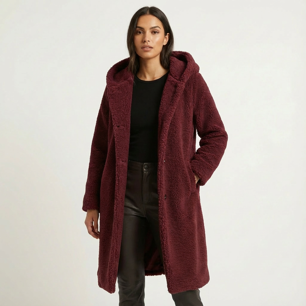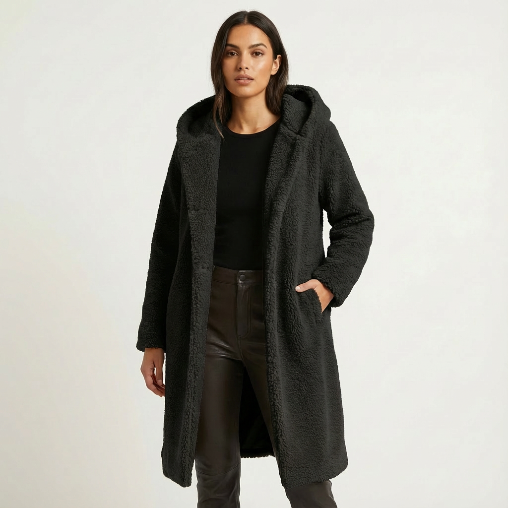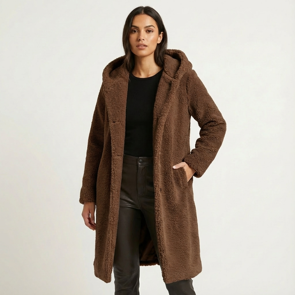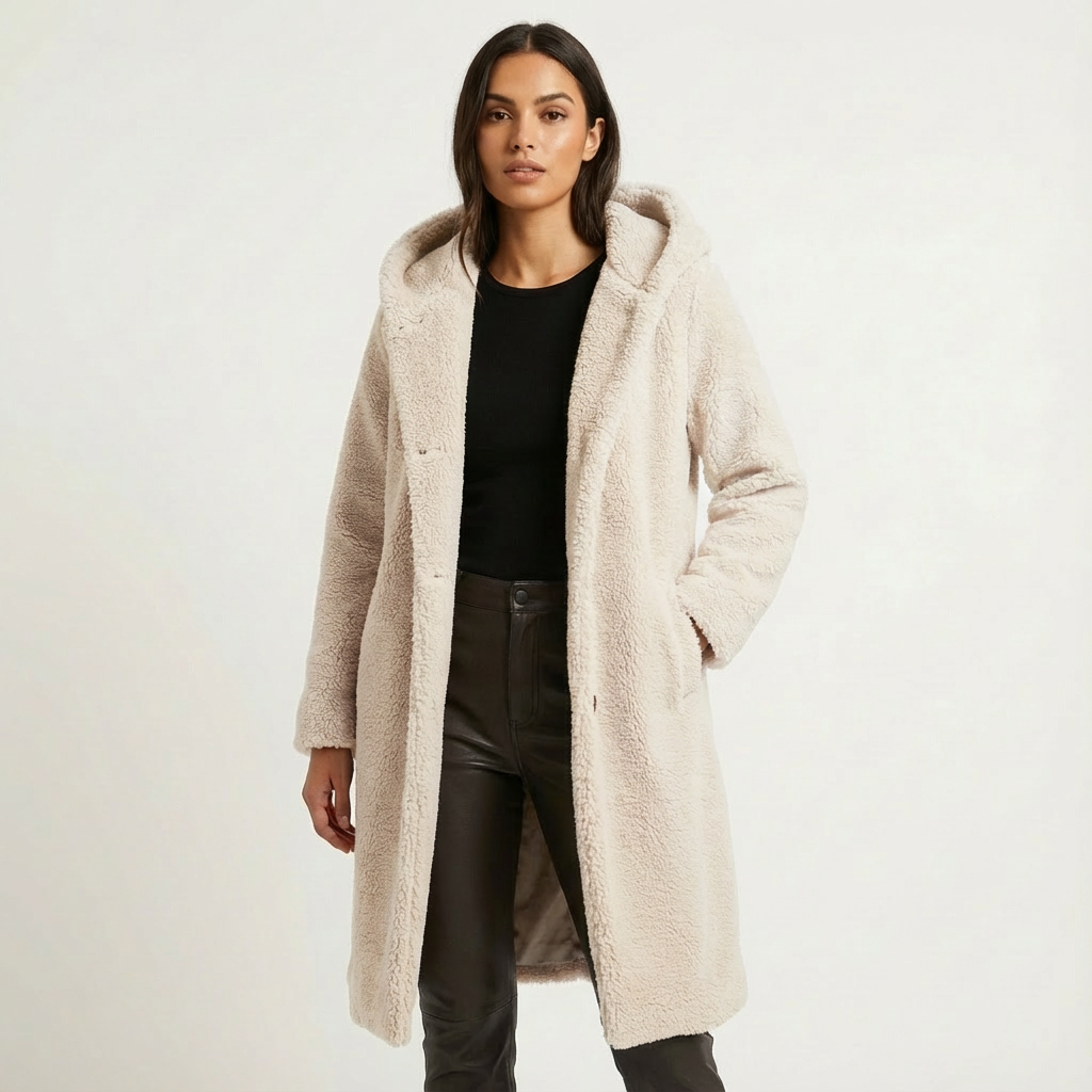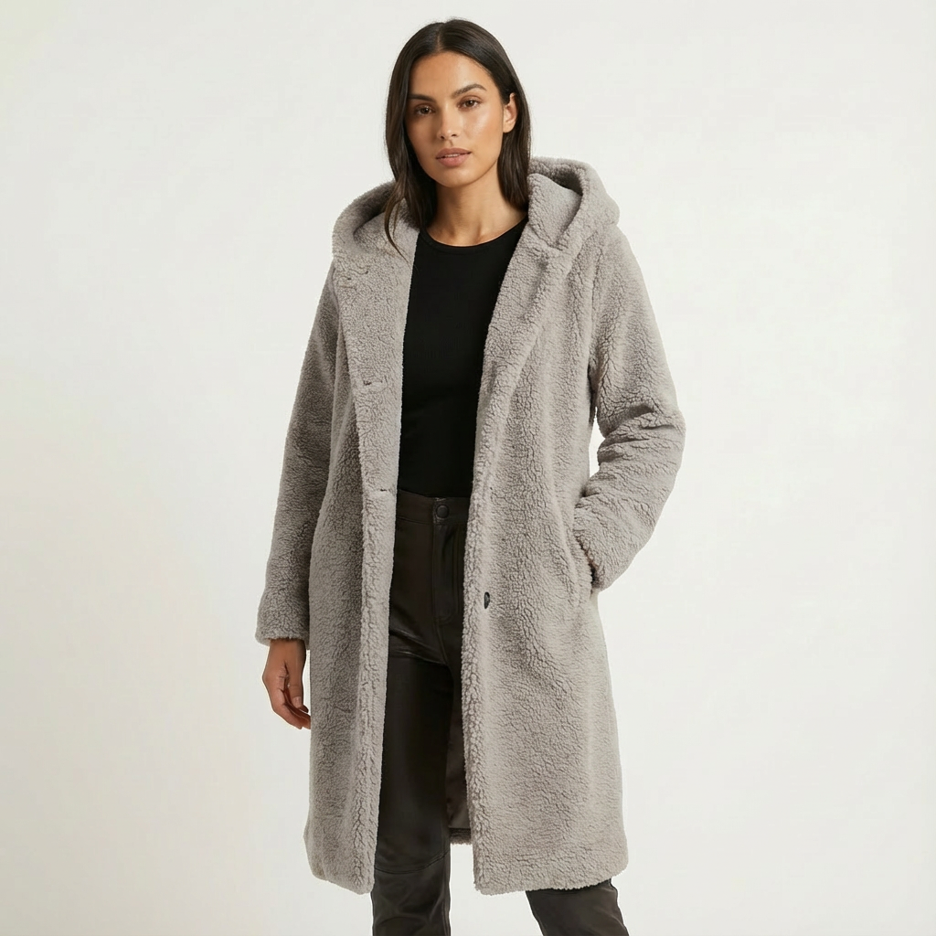 A faux-fur hooded winter coat with a longline silhouette. Plush texture and an oversized hood deliver warm coverage for cold days.
