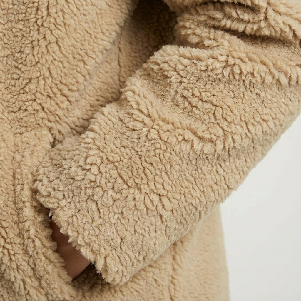 Design: Longline silhouette; oversized hood; plush faux-fur texture; straight hem; clean finish.