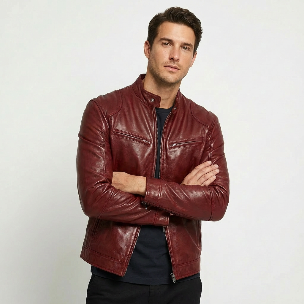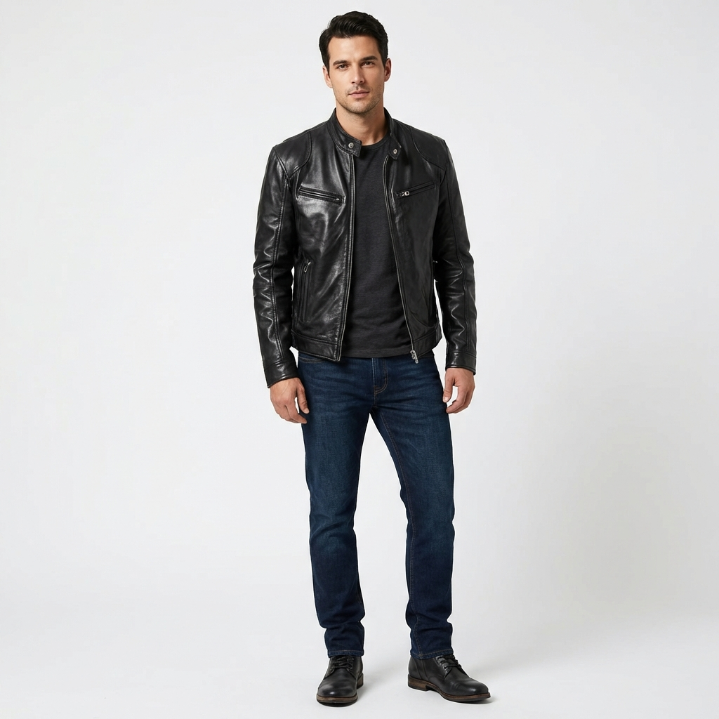 Defined and easy to style, Men’s Stylish Leather Jacket with Zip Front is a fitted outer layer designed for smart-casual wear across the seasons. The Leather Jacket name highlights the genuine leather outer, stand collar with snap detail, and clean zip front for a streamlined look.