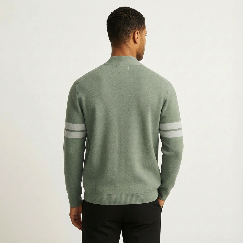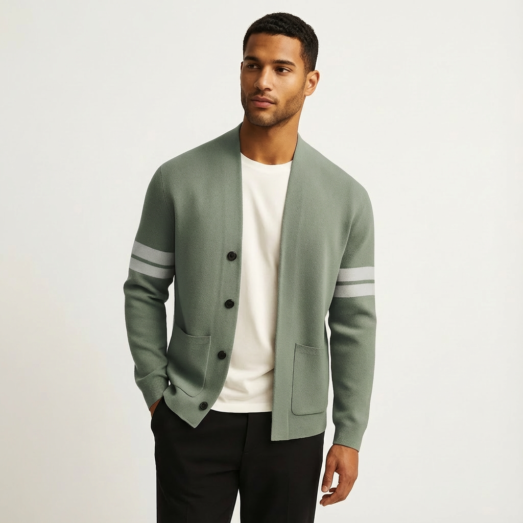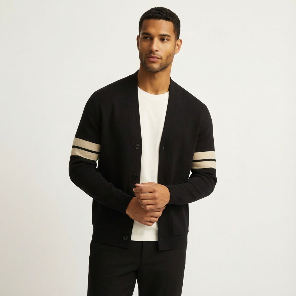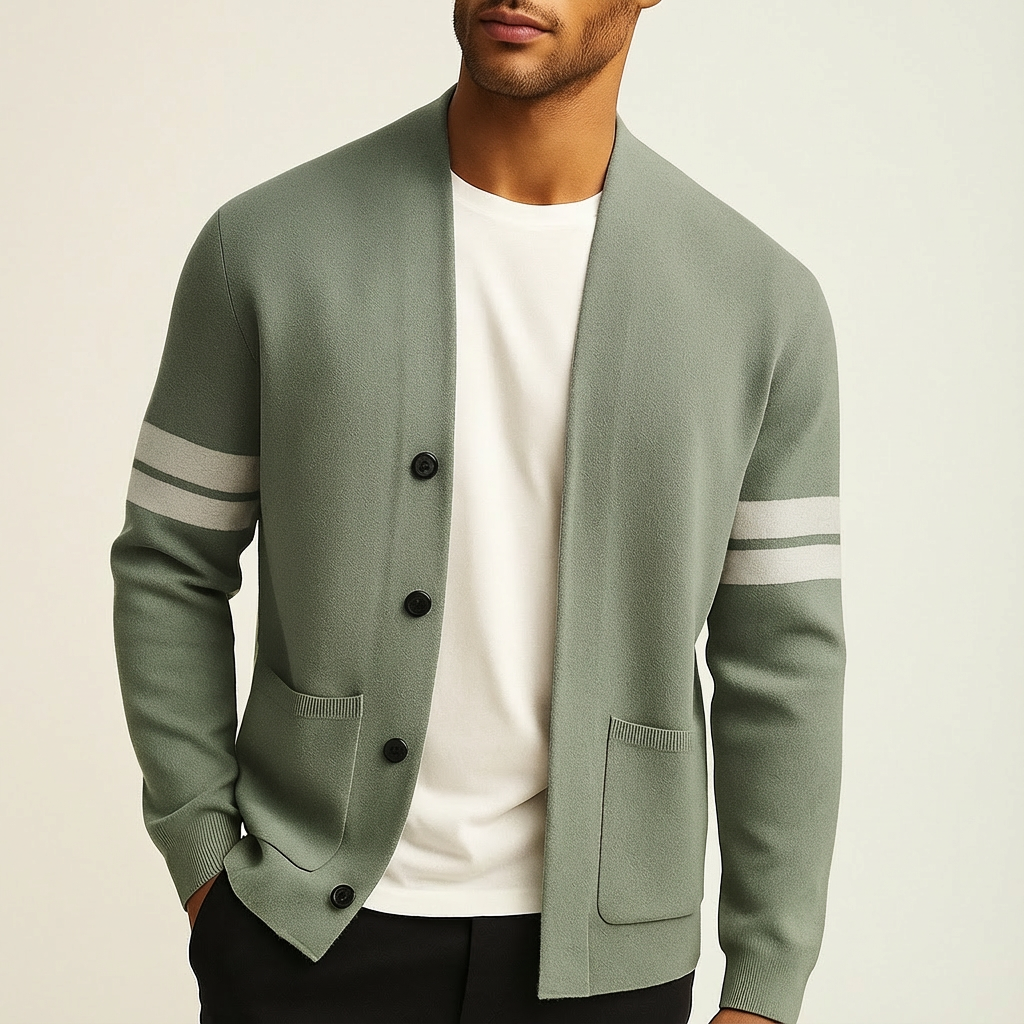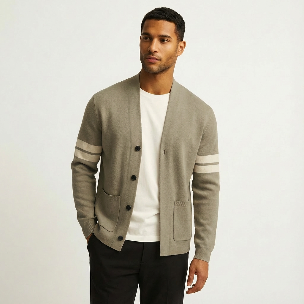 A merino wool-blend cardigan with sleeve stripes and button-front detailing. Lightweight warmth and functional pockets make everyday layering easy.