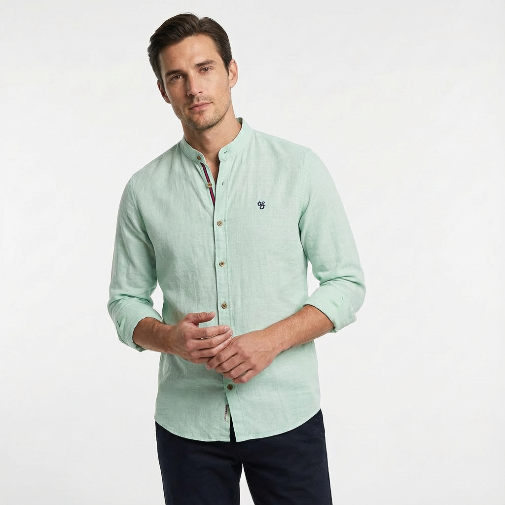 A band-collar shirt with a clean, modern line. The smooth woven fabric and curved hem style easily with denim or tailoring.