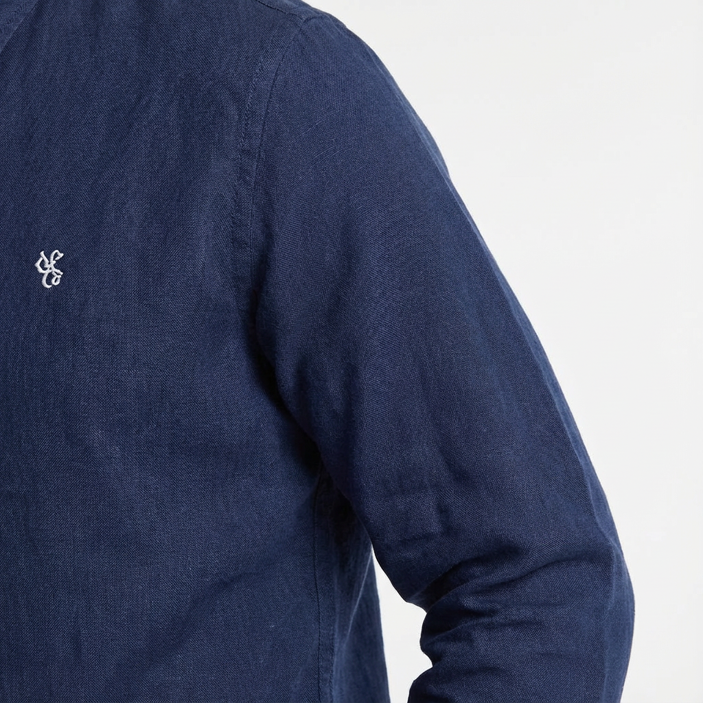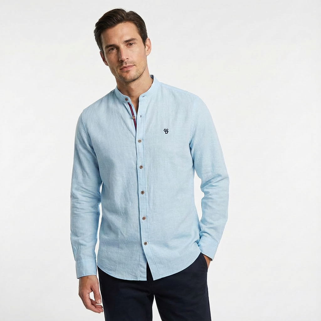 • Design: Stand collar; button front; long sleeves with button cuffs; small chest embroidery; curved hem.