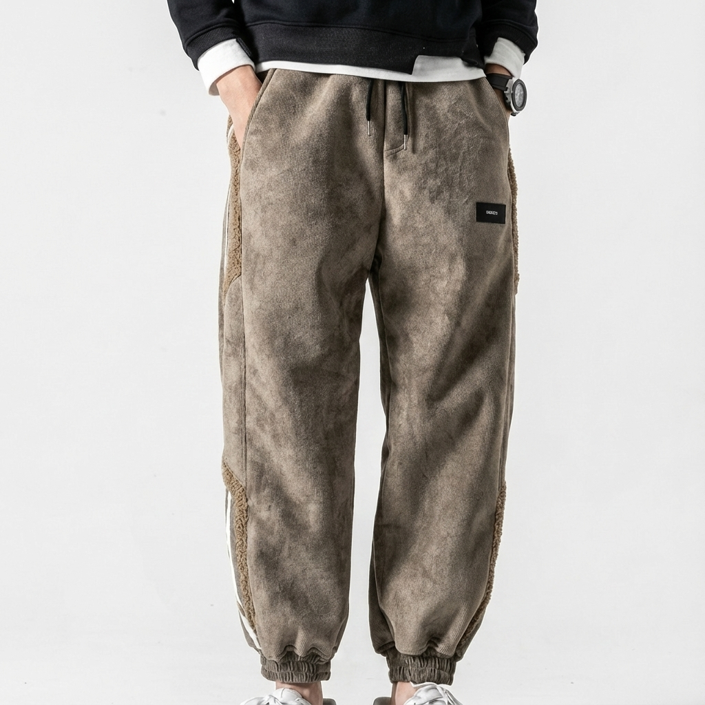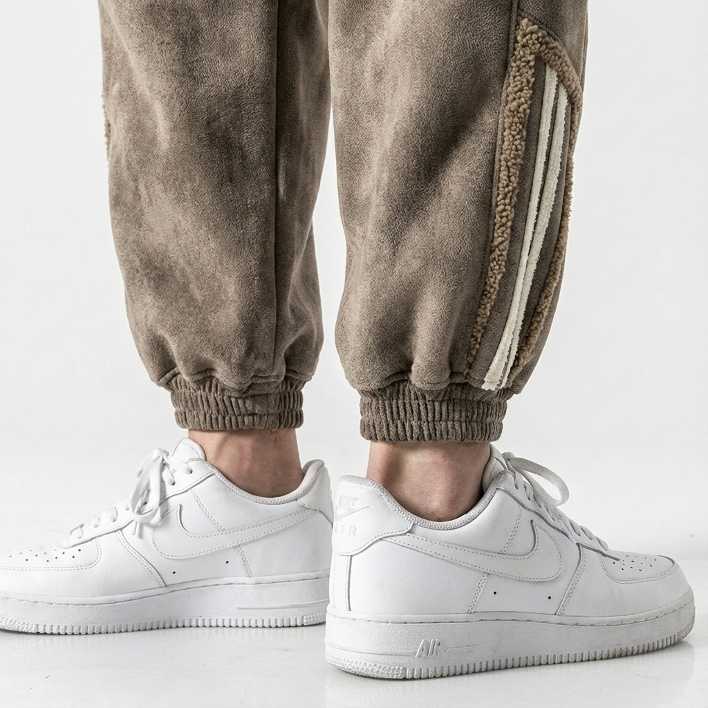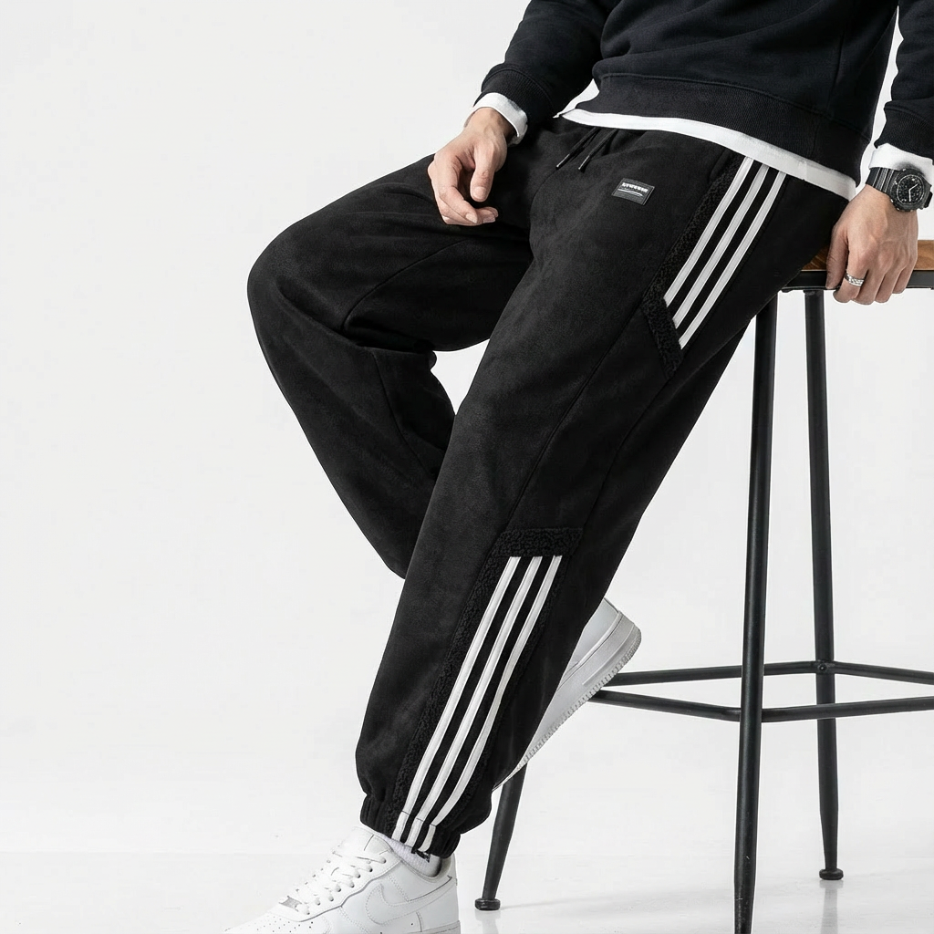 Design: Jogger silhouette; contrast side stripes; warm fleece lining; clean finish.