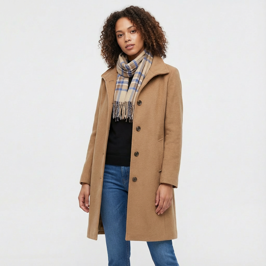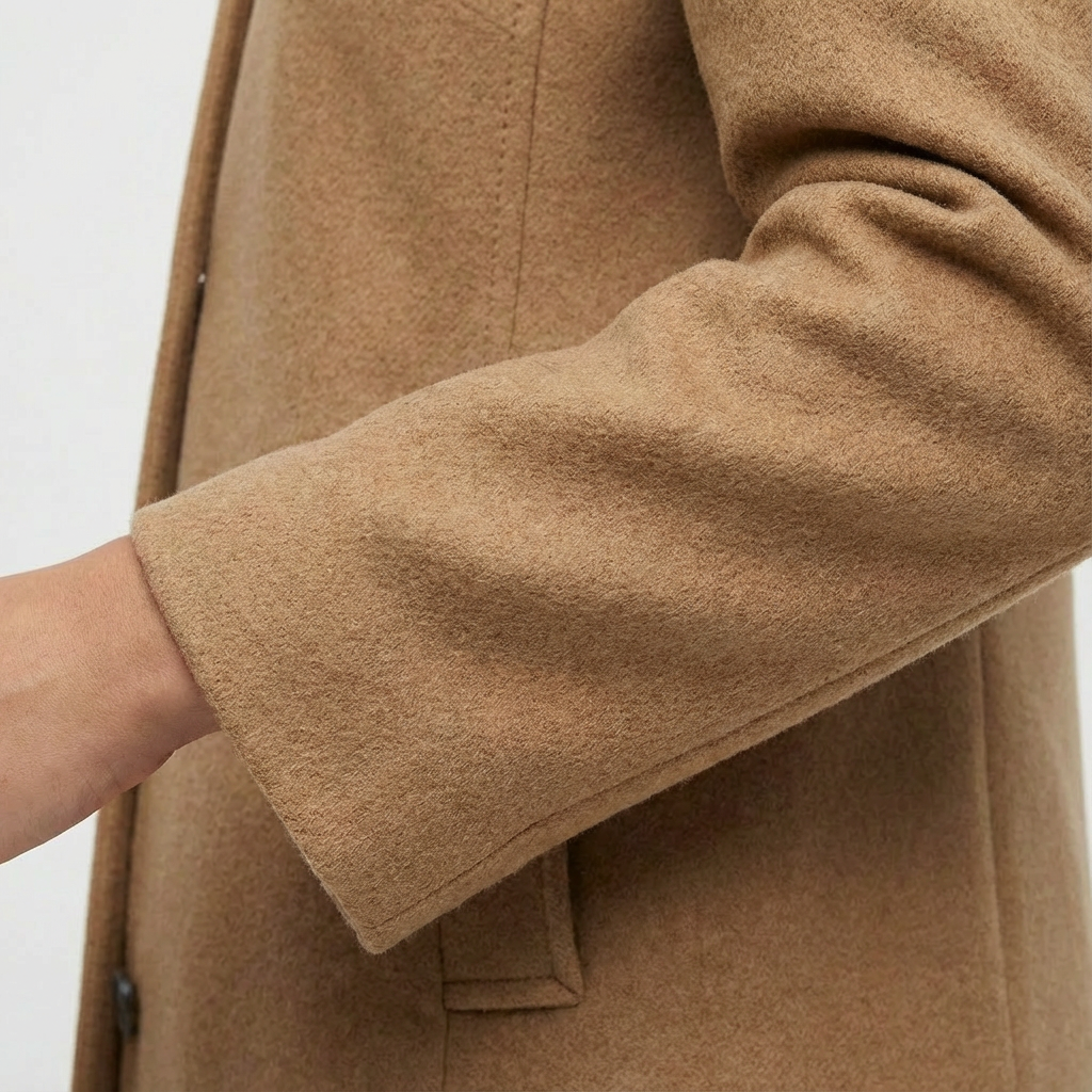 A classic winter coat with a button-front placket and a clean, longline shape. Lightly tailored through the body with side pockets for everyday practicality.