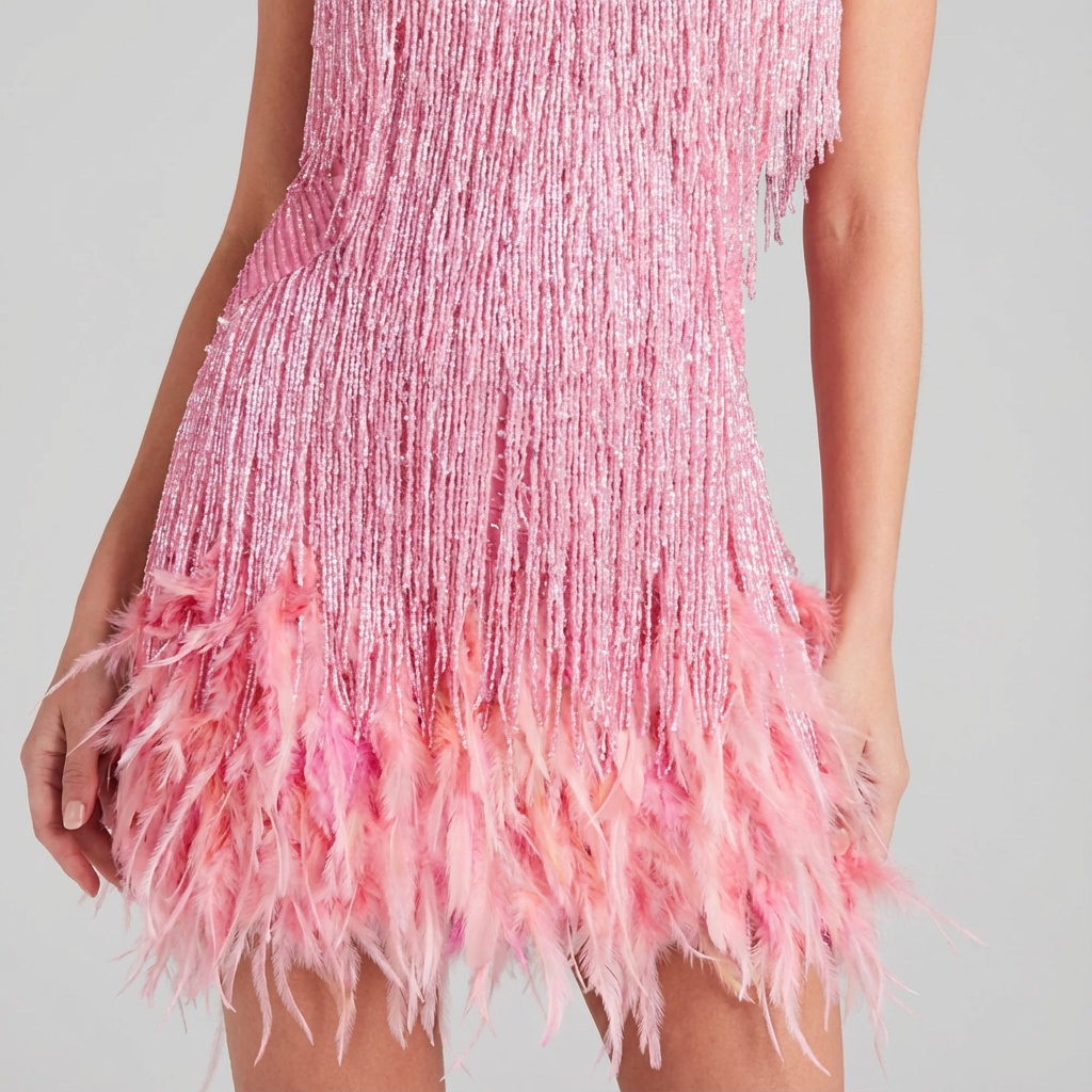 Sparkle-ready for big nights out, Women’s Sequin Mini Party Dress with Feather Accents is a fitted mini designed with delicate spaghetti straps, all-over shimmer, and statement trim for a high-impact party look. This Party Dress is all you need, the title highlights the sequin fringe, feather accents, and mini length that keep styling bold and effortless.