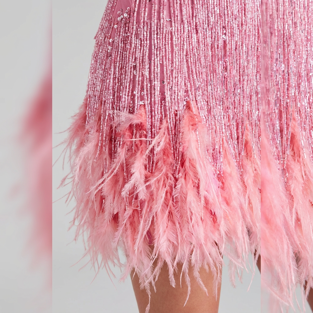 Material: Sequin-embellished fabric with tassel and feather trim