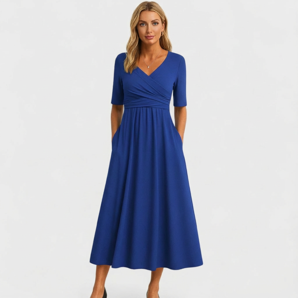 Elegant and easy to wear, Women’s Wrap Midi Wedding Guest Dress with Pockets is a refined occasion dress designed with a wrap-style bodice, short sleeves, and a flowing longline skirt, finished with handy side pockets. This Wedding Guest Dress is all you need, the flattering crossover front, practical pocket detail, and the longer length that suits formal days and evenings.