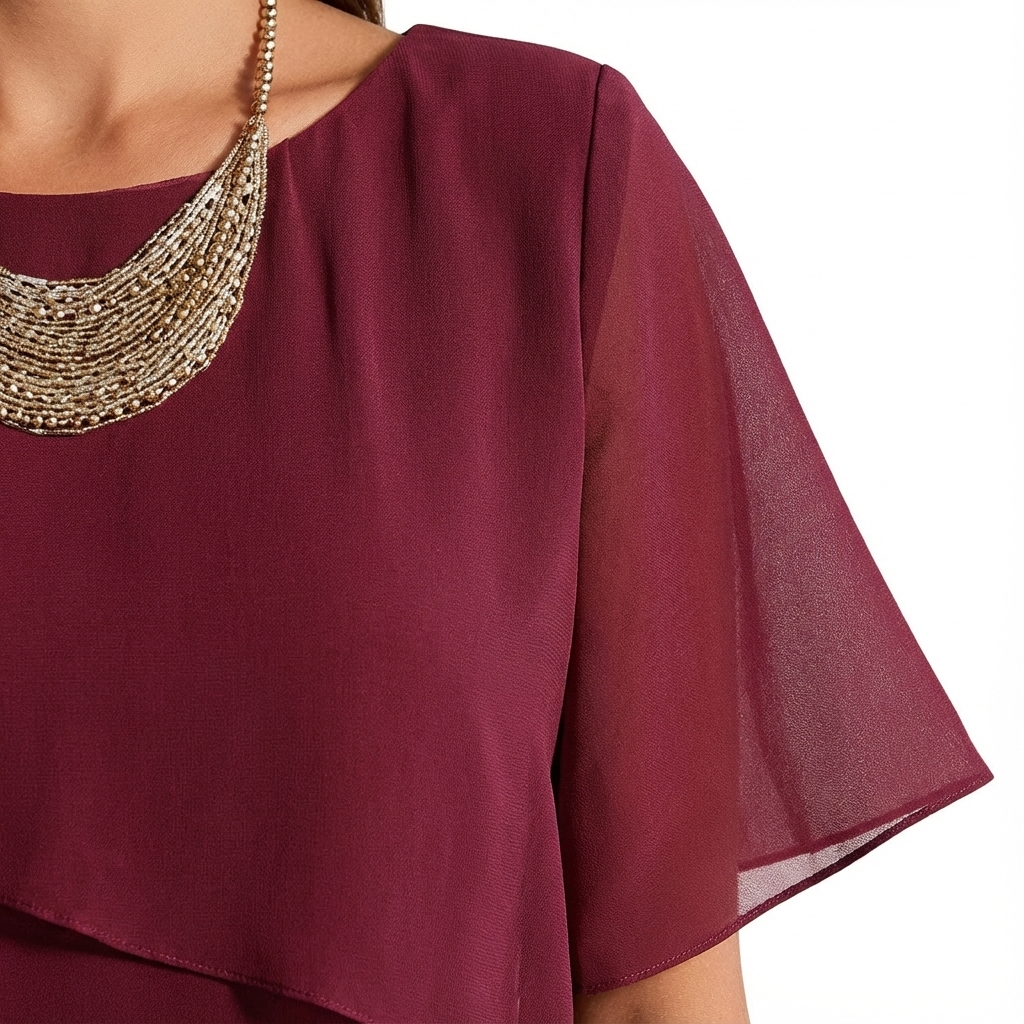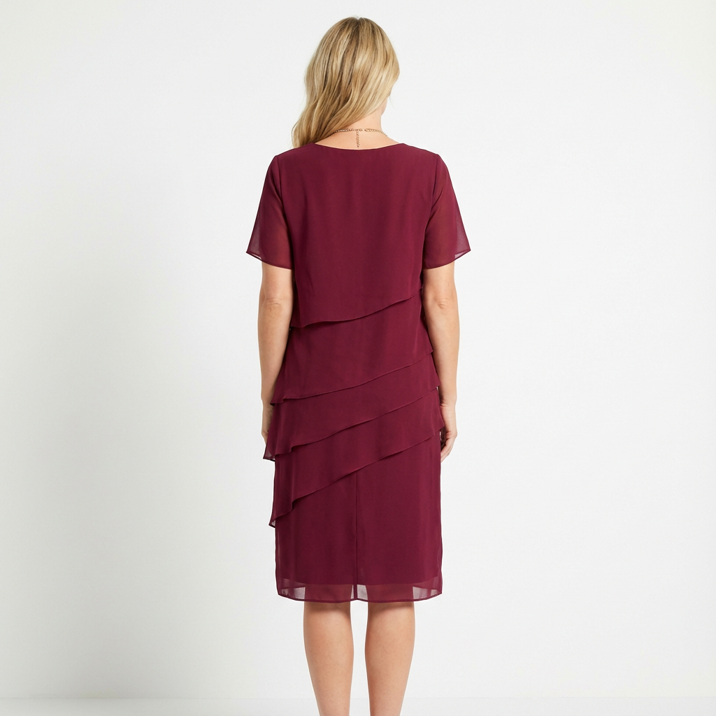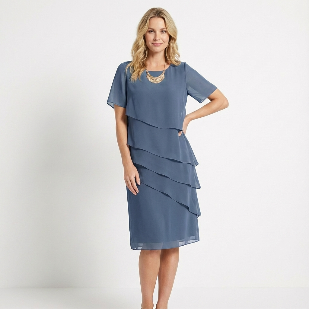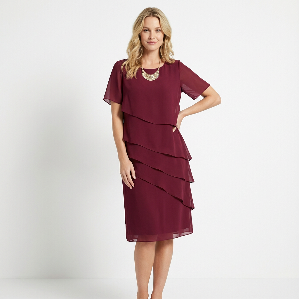 A tiered chiffon dress with a lightweight drape. Flowing layers create a relaxed, flattering silhouette for day-to-dinner dressing.