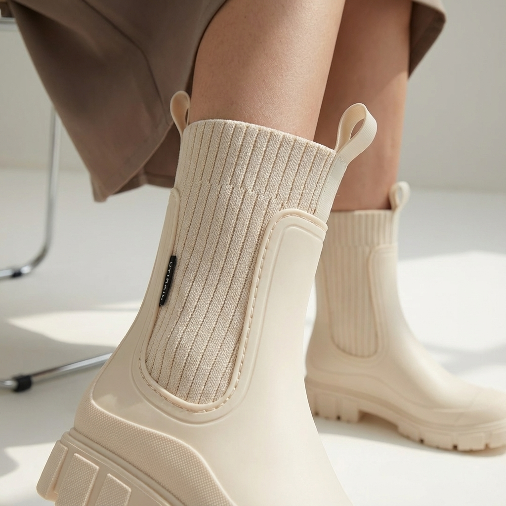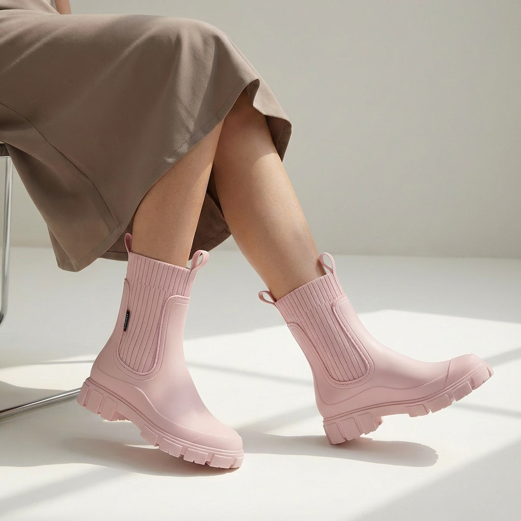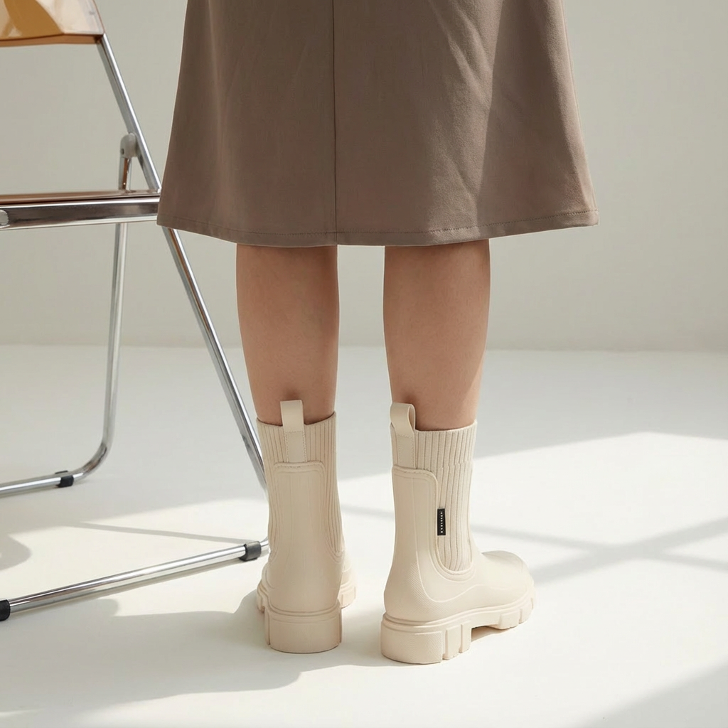 Design: Wellington boot silhouette; waterproof construction; slip-resistant outsole; round toe; smooth finish.