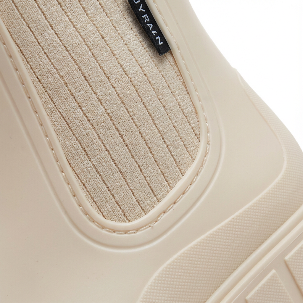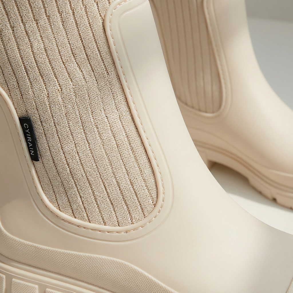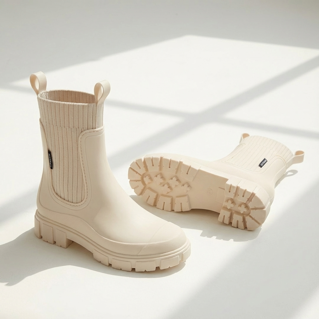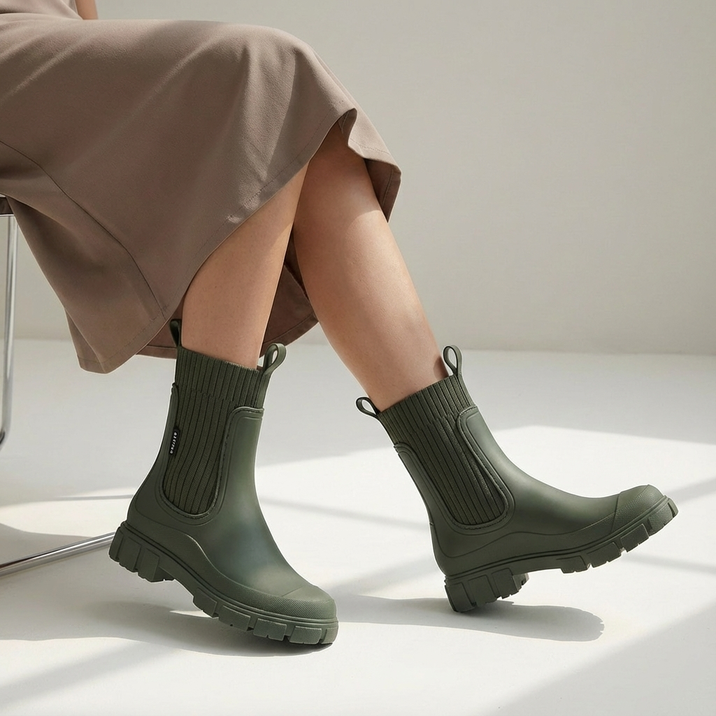 Design: Wellington boot silhouette; waterproof construction; slip-resistant outsole; round toe; smooth finish.
