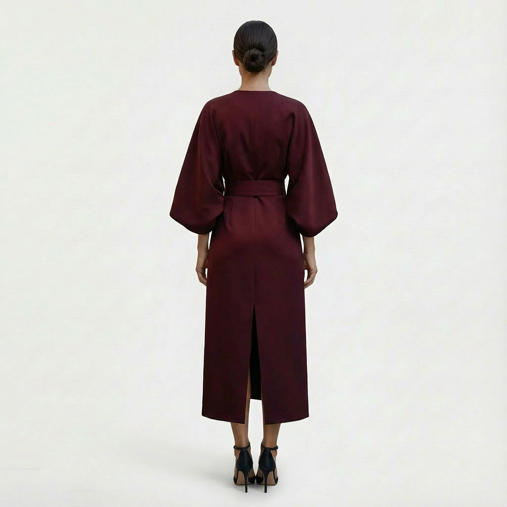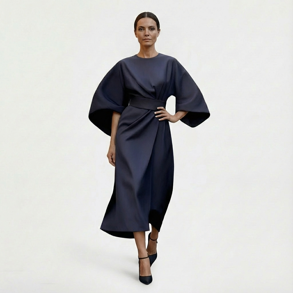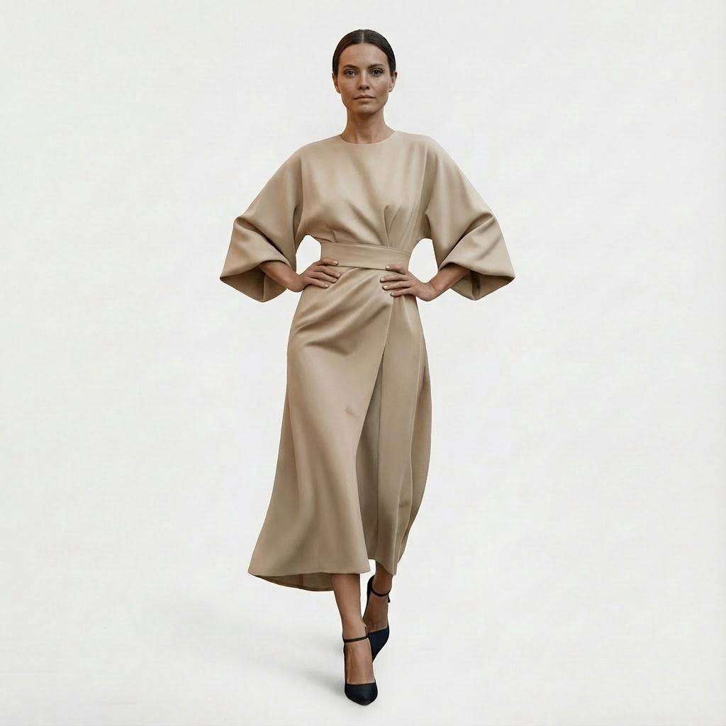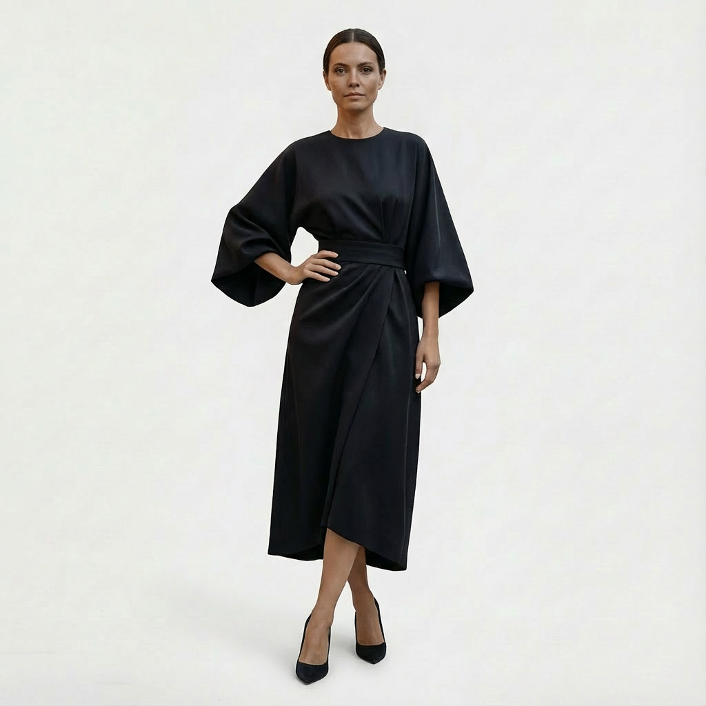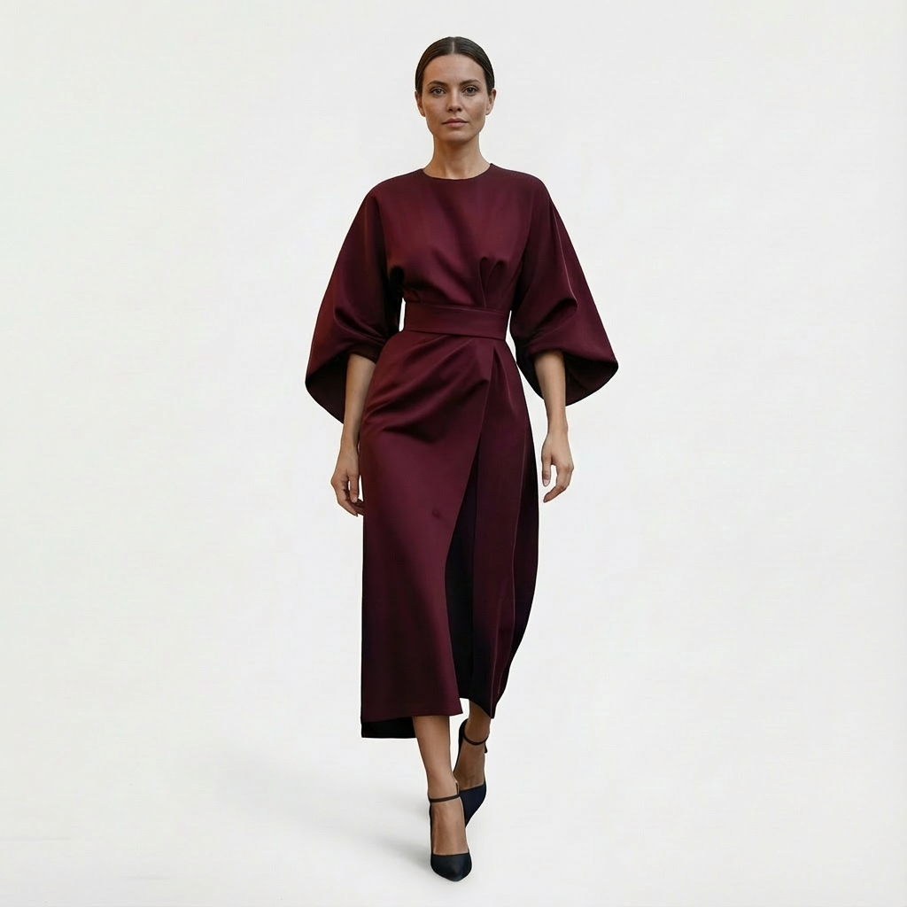 Elegant and minimal, Women’s Maxi Belted Evening Dress with Waist Tie is a flowy maxi with wide kimono sleeves, a clean round neckline, and an adjustable waist tie to shape the silhouette from relaxed to softly defined. This Evening Dress has it all, the soft drape and ankle-grazing length make it an easy choice for dinners and understated occasions.